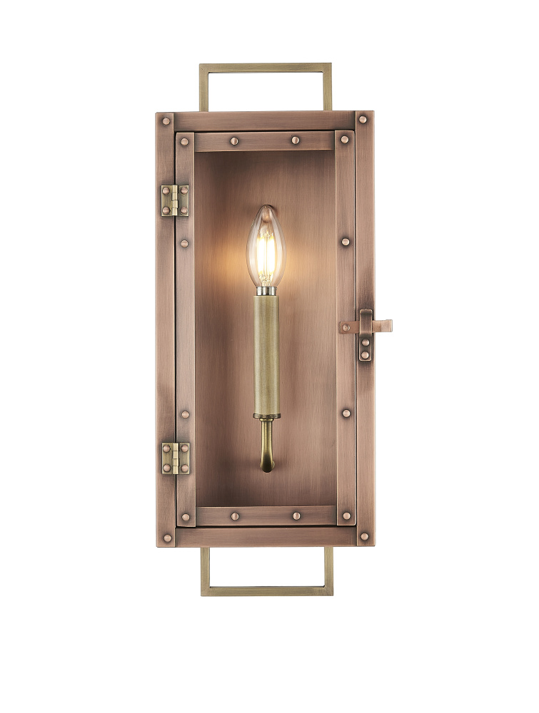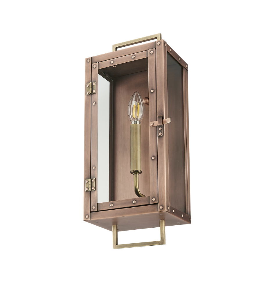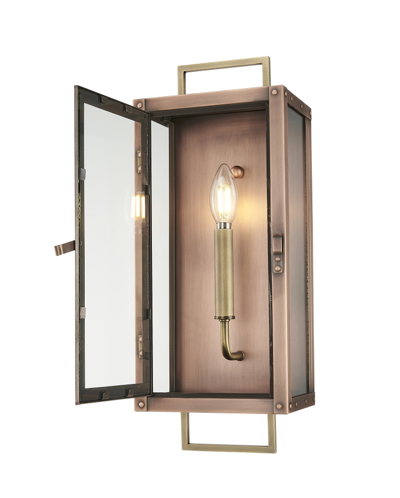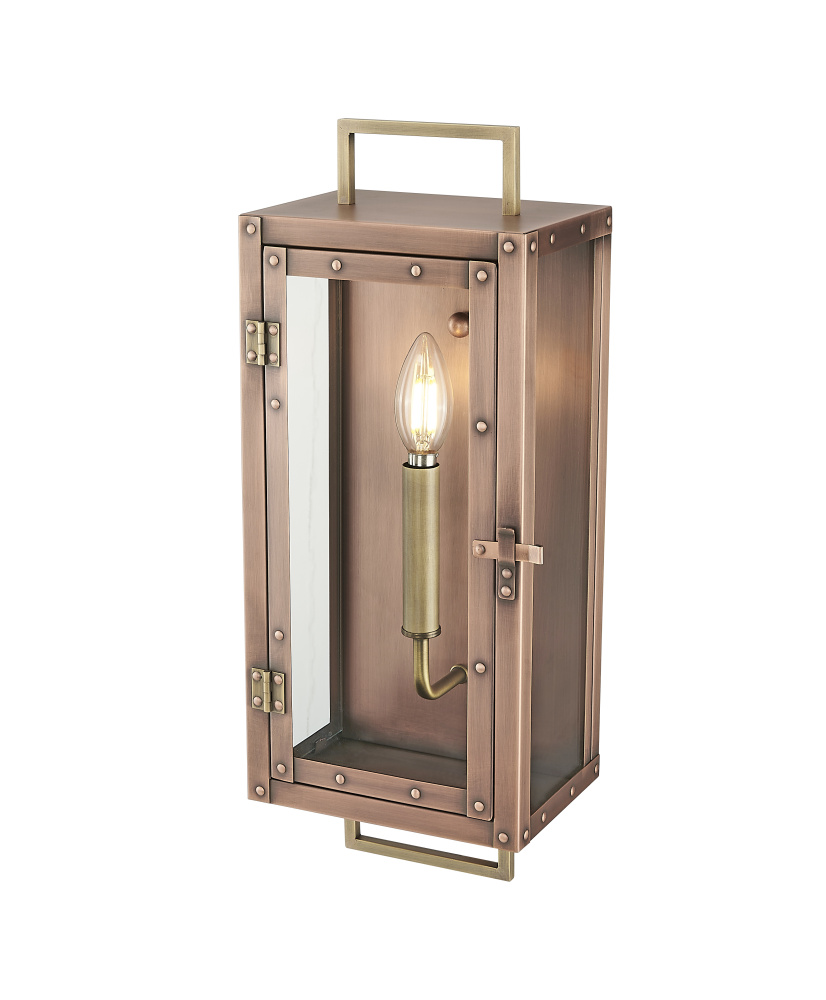 1010CP - 18 in. 1-Light Antique Copper With Brass Accents Outdoor Wall Lantern With Clear Glass Panes