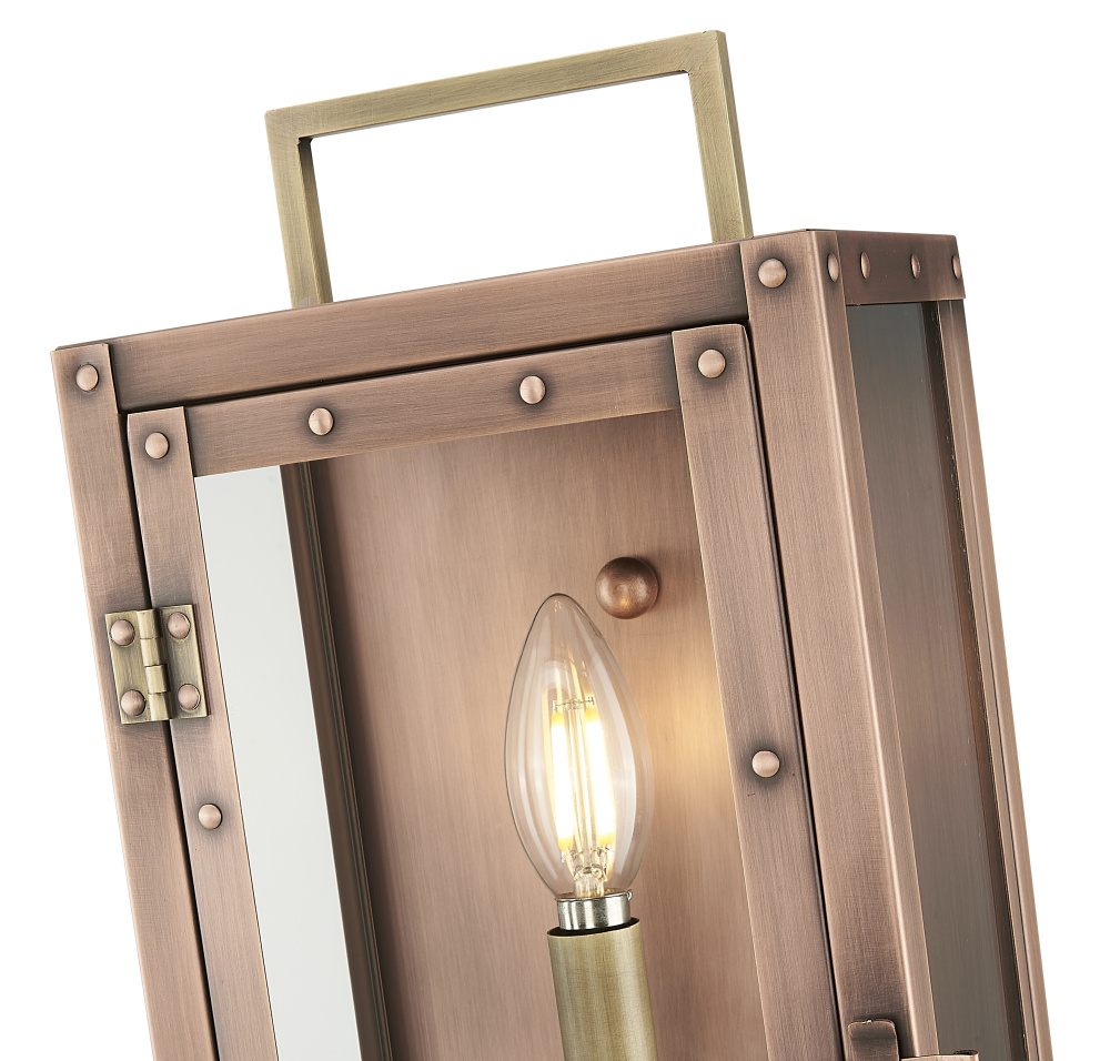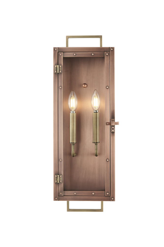 1011CP - 24 in. 2-Light Antique Copper With Brass accents Outdoor Wall Lantern With Clear Glass Panes