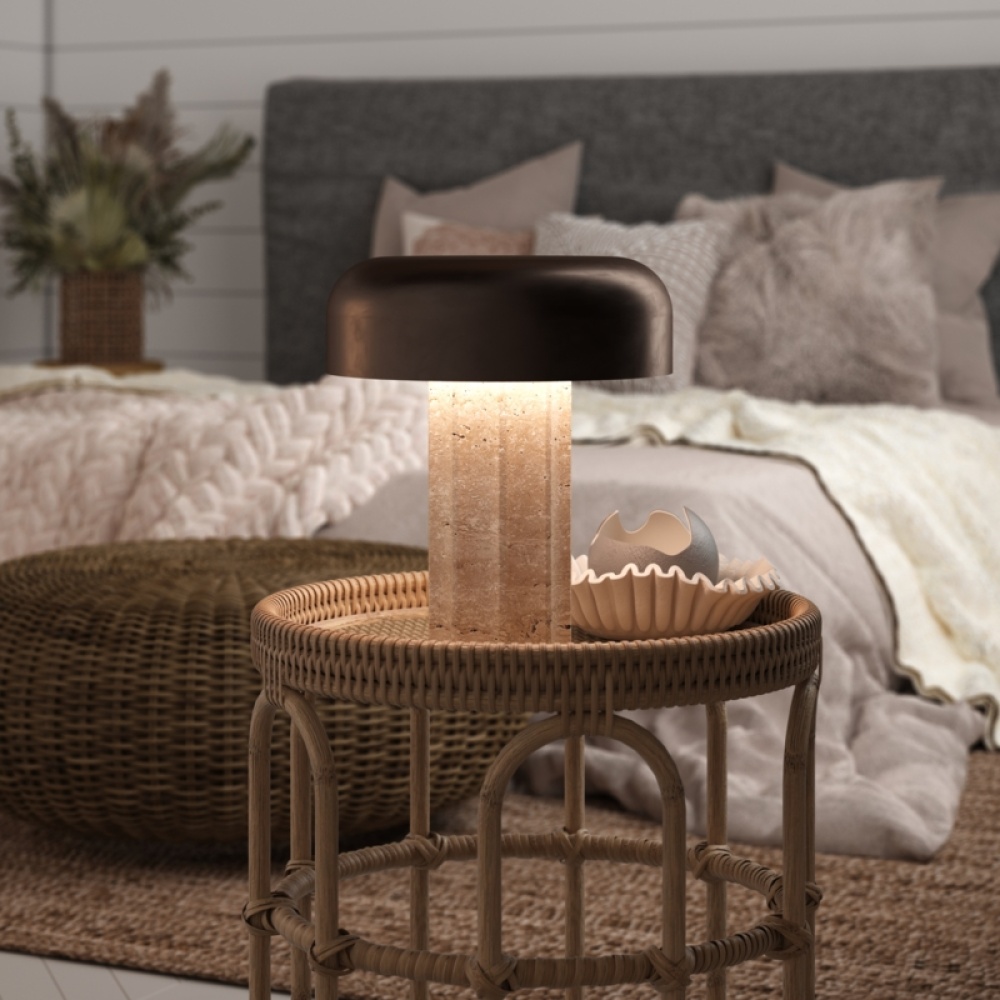 FLUTED COLUMN - where ancient architecture meets luxurious illumination. This stunning accent piece draws inspiration from the majestic columns of Greek antiquity, transformed into a portable lighting masterpiece for discerning interiors. Each base is meticulously carved from genuine natural stone - either sumptuous black marble or elegant travertine - creating a foundation of enduring luxury that supports a perfectly proportioned dome in either chocolate bronze or brushed brass. With its substantial dimensions of 10" diameter and 12" height, FLUTED COLUMN makes a commanding statement at 10 pounds. This substantial presence from Kibün by Bulbrite combines the timeless gravitas of classical architecture with modern cordless convenience, liberating your design vision from the constraints of outlets and cords. At Kibün by Bulbrite, we've leveraged over 50 years of lighting expertise to create a truly portable lighting solution. FLUTED COLUMN freeing your space from the constraints of cords and outlets, offering remarkable flexibility for both indoor and outdoor settings. Experience customizable brilliance with three illumination levels - from subtle 60-lumen ambiance to brilliant 300-lumen task lighting. The 2700K warm white temperature and exceptional 90+ CRI ensures colors appear rich and true to life under FLUTED COLUMN’s gentle radiance. Choose between two exquisite pairings - Brushed Pewter dome with Travertine base or Brushed Brass dome with Black Marble base. Due to the inherent uniqueness of natural stone may feature subtle variations in patterning and coloration, ensuring your lighting piece is truly one-of-a-kind.