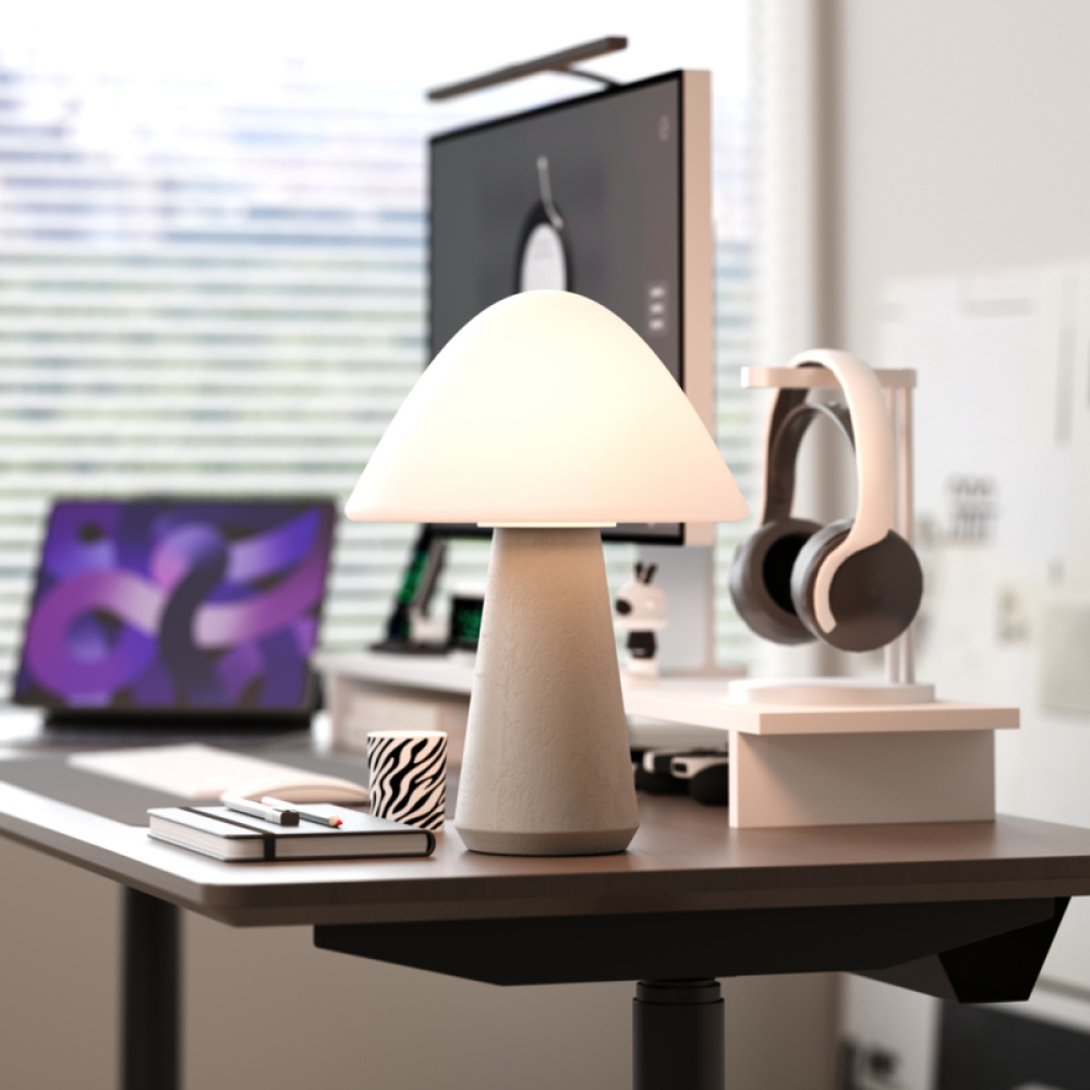 MUSHROOM - where 1960s whimsical design meets contemporary illumination. This delightful accent piece captures the playful essence of iconic mid-century mushroom lamps, reimagined for today's design-conscious spaces. The exquisite cased two-layer opal glass shade creates a mesmerizing soft glow that transforms any environment, while the distinctive cast "color-in" concrete base provides both stability and artistic interest. With its perfectly proportioned dimensions of 8.7" diameter and 12.25" height, MUSHROOM makes a charming yet substantial presence at 4.7 pounds. This portable lighting solution from Kibün by Bulbrite effortlessly moves with you throughout your home, freeing your lighting design from the constraints of outlets and cords. At Kibün by Bulbrite, we've leveraged over 50 years of lighting expertise to create a truly portable lighting solution. MUSHROOM liberates your space from the constraints of cords and outlets, offering remarkable flexibility for both indoor and outdoor settings. Customize your ambient lighting experience with three distinct brightness levels - from a subtle 60-lumen whisper to a room-filling 300-lumen brilliance. The warm white 2700K temperature combined with exceptional 90+ CRI rendering ensures colors appear rich and true beneath MUSHROOM's gentle luminance. Available in four distinctive finishes - classic Off-White, soothing Stone Blue, warm Terracotta, or sophisticated Grey - each MUSHROOM features subtle variations in its concrete base, ensuring your lighting piece is truly one-of-a-kind. Due to the inherent uniqueness of natural stone may feature subtle variations in patterning and coloration, ensuring your lighting piece is truly one-of-a-kind.