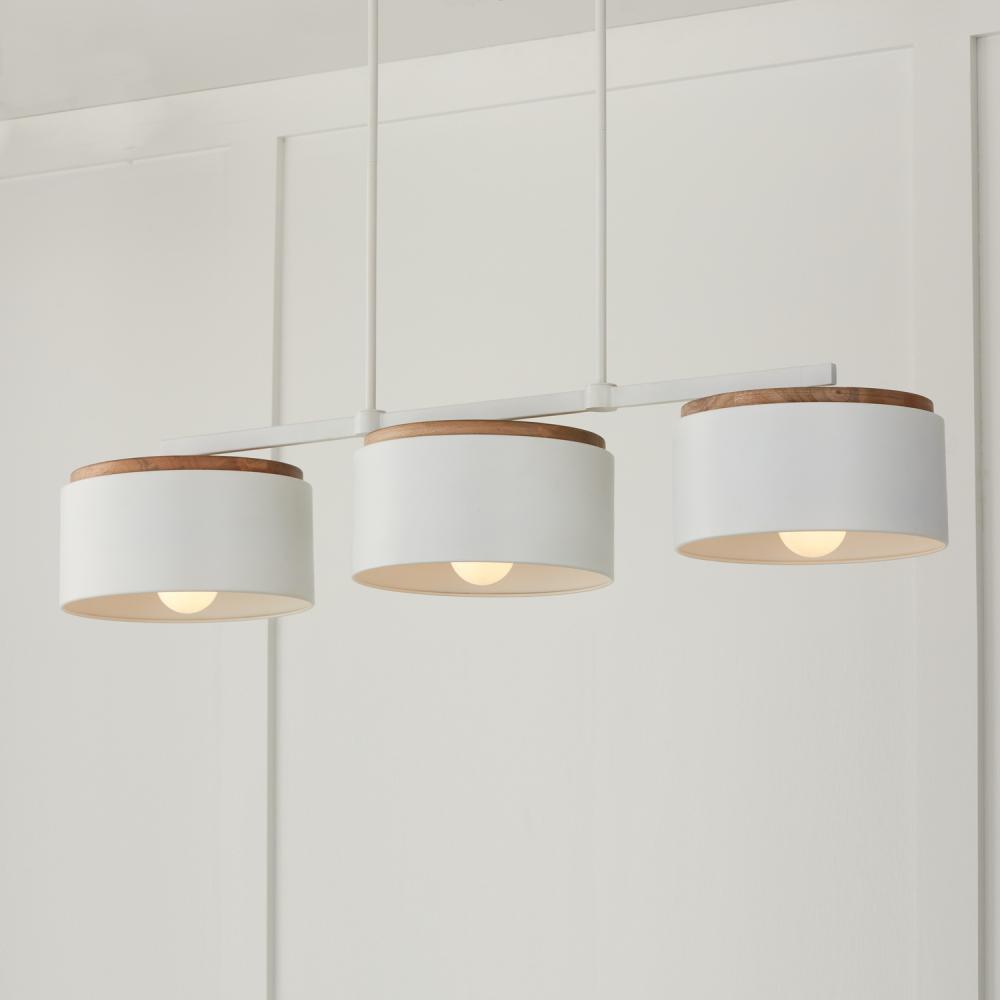 Mango wood and modern design form the Liam Linear Chandelier. The Matte White metal shades and the Light Wood details create a visual balance for natural Scandinavian style.
