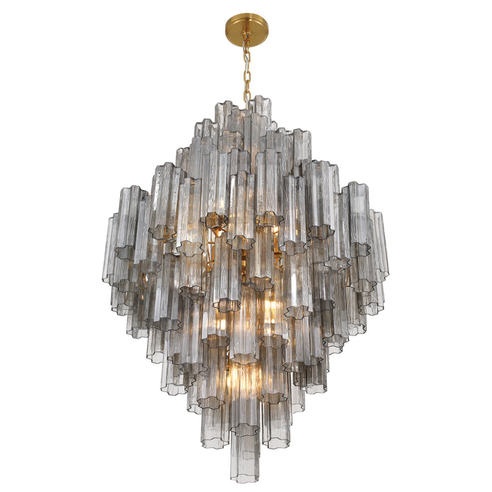 The captivating Addis Lighting Collection is a modern-day interpretation of the iconic mid-century Tronchi chandelier. Inspired by its predecessor's sleek lines and geometric shapes, the Addis features a polished Chrome or Aged Brass metal frame that exudes sophistication and style. Its unique design showcases transparent tiers of textured Tronchi glass tubes, forming a mesmerizing 5-point rounded star shape. Choose from a range of glass colors, including clear, amber, smoke, and white, or the stunning Autumn option, which features a captivating multicolor disposition of amber, clear, and smoke Tronchi glass. The Addis Lighting Collection offers various sizes and finishes, allowing you to find the perfect fit for your space while adding a touch of timeless elegance.