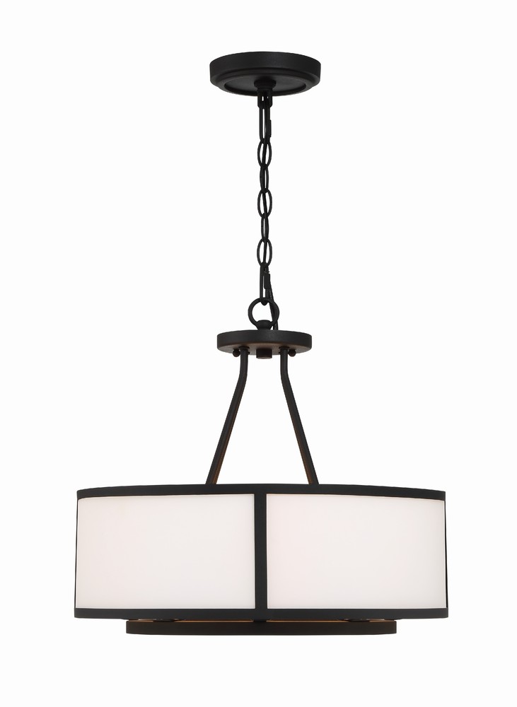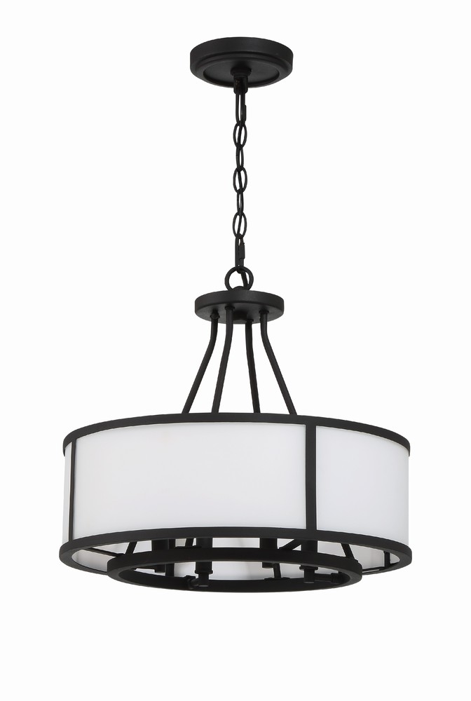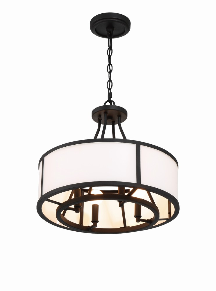 Showcasing a classic drum pendant, the Bryant is crafted with a white glass shade and black steel frame. The outer drum surrounds an inner suspension of candelabra sockets. The contrasting materials and bold graphic lines provide a design-driven style and a striking visual accent to many interior settings.