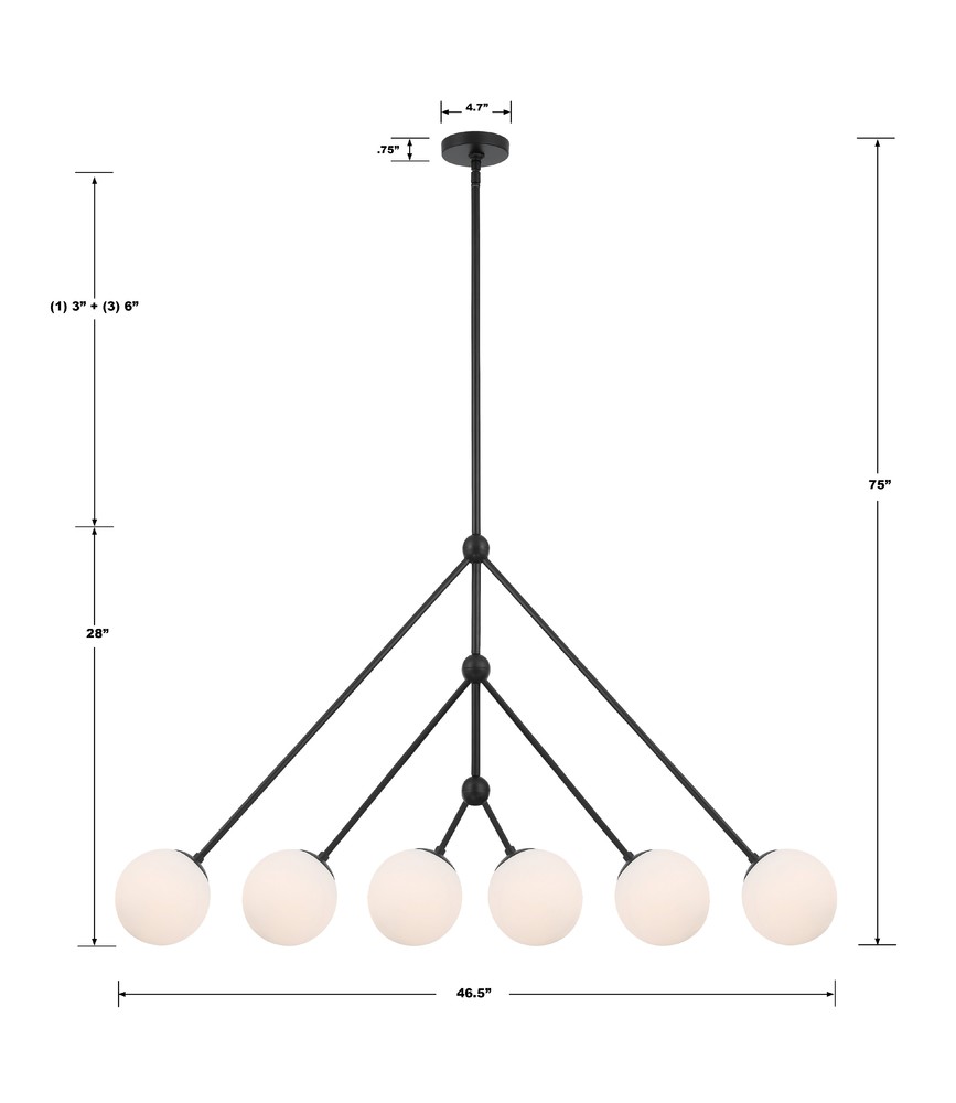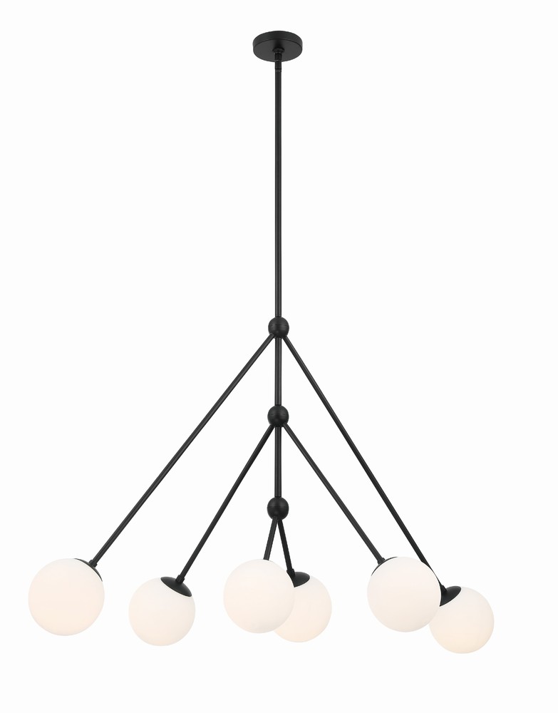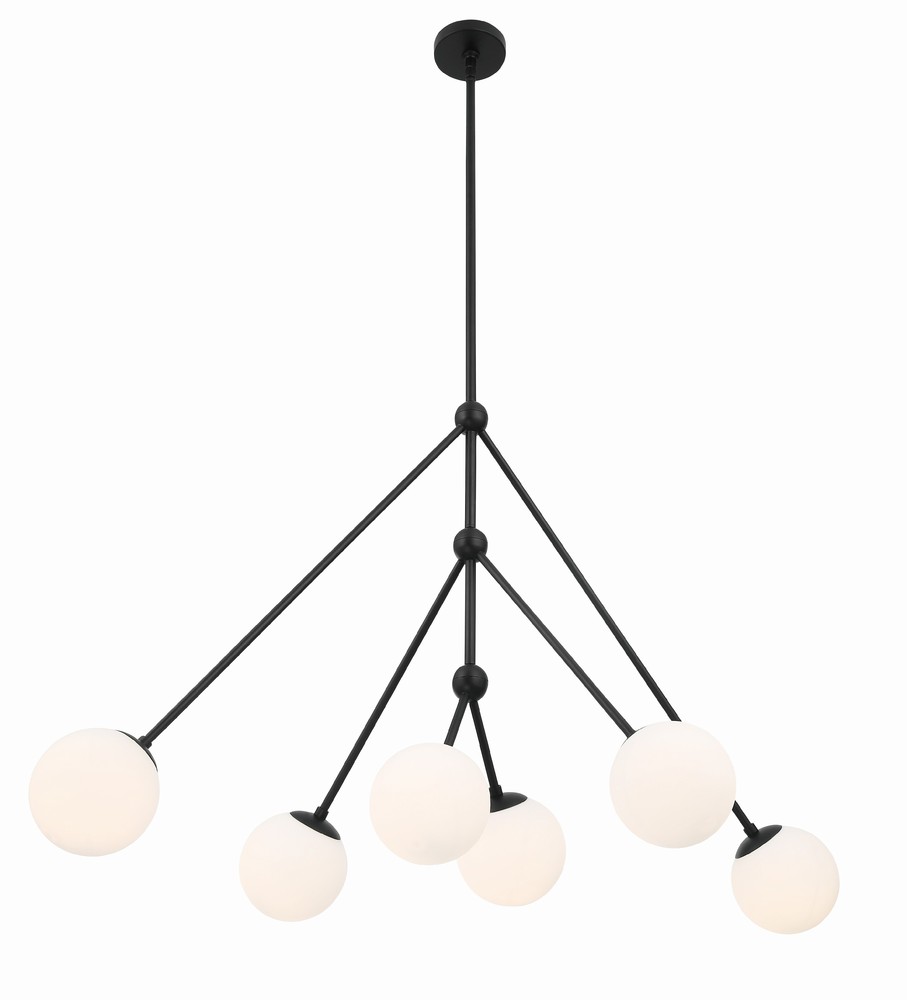 Mid-Century style meets modern design with our Omni collection. A down rod features six long-stemmed metal poles with suspended lights and opal glass shades. This fixture makes a statement in a dining room, living room, or entry. Illuminate any space with a striking statement.