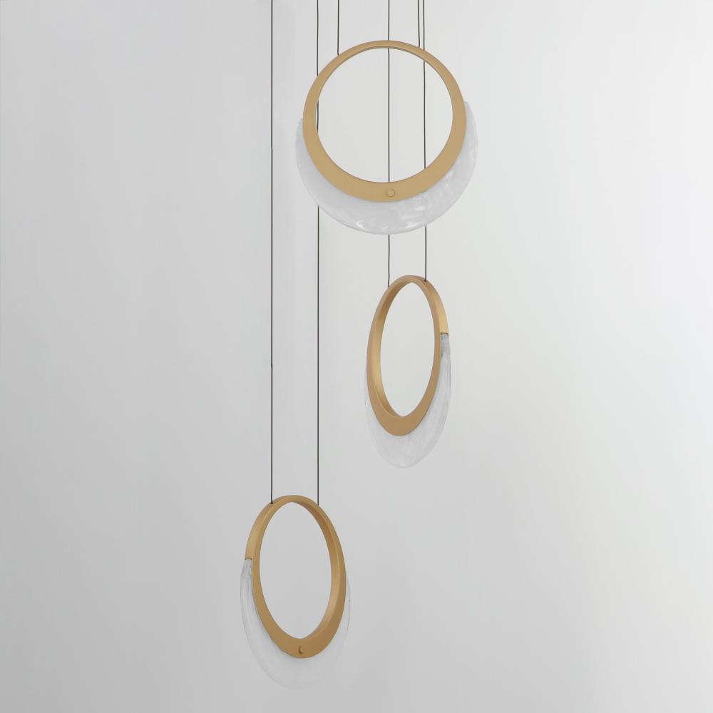 Named for the Greek constellation associated with music and harmony, Lyra strikes a poetic balance between sculpture and light. Crescent-shaped cast glass, swirled in clear and white, is cradled in golden rings and suspended by slender black cables to evok