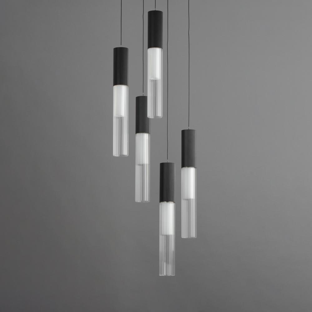 A refined play of texture and proportion, this series juxtaposes vertically fluted aluminum housings with linear reeded glass tubes. Offered in Gold or Matte Black finishes, each form integrates frosted glass diffusers that soften the powerful LED illumina