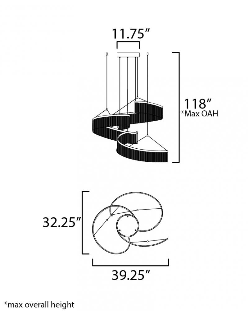Composed of gently curving aluminum channels in Matte Black that supports a patterned translucent acrylic arranged in groups of vertical stripes, this series of pendants and coordinating ADA sconce expresses a musical quality in brilliant LED light. The wa