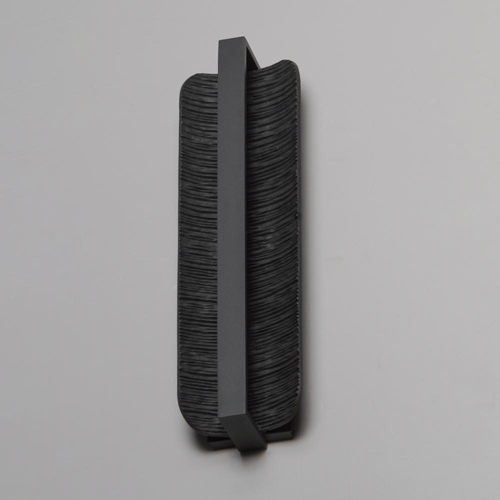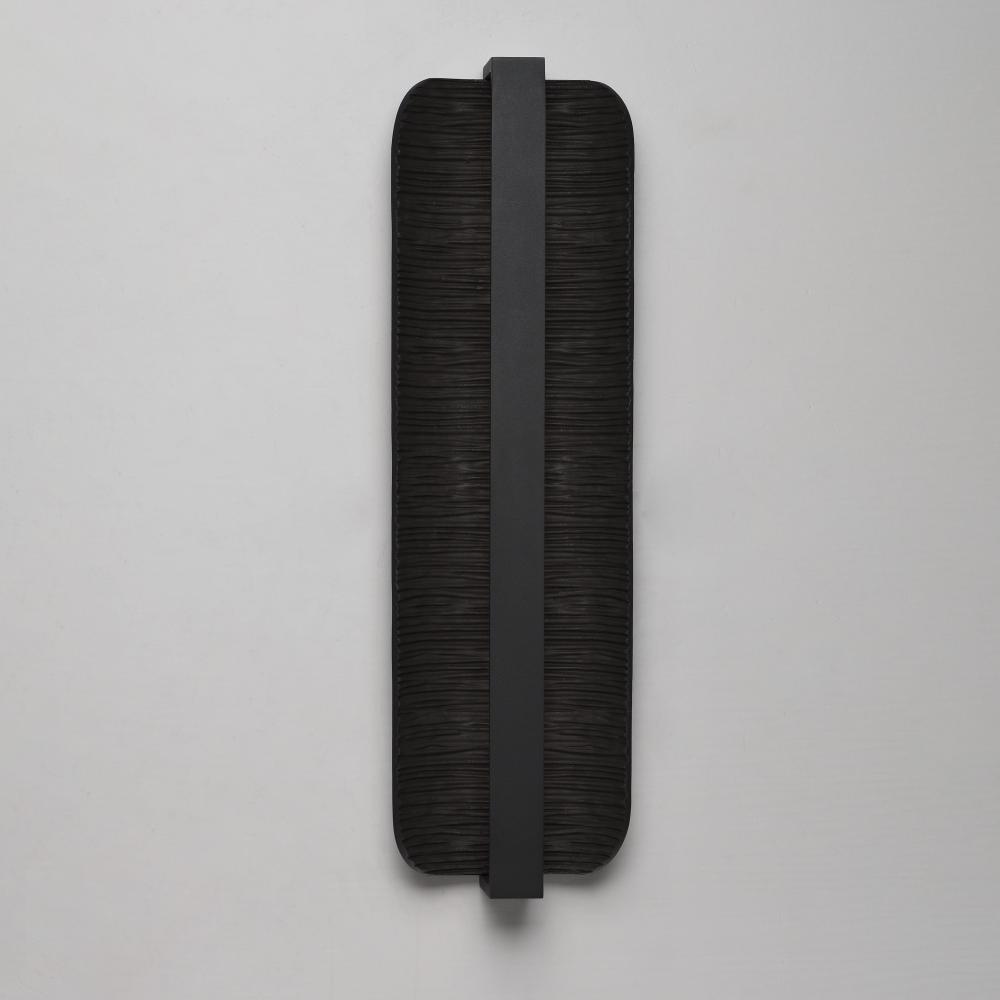 A line of indirect LED lighting shines back on a rough-hewn cast aluminum plate with an erosion pattern that curves slightly at its ends. The neutral 3000K color temperature casts warm lighting that creates shadows and depth on the fixtures surface. An ear