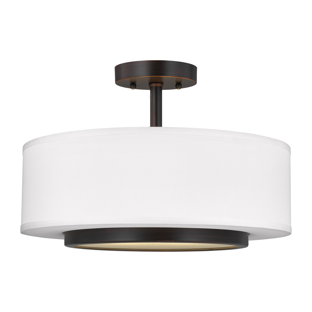 The Nance two light indoor semi-flush convertible in bronze enhances the beauty of your home with ample light and style to match today's trends. The mid-century inspired Nance lighting collection by is a versatile transitional design which fits in a wide array of traditional or contemporary settings. The tapered, off-white, faux silk shades add warmth and sophistication. The large pendant and semi-flush faux silk drum shades are complemented nicely with Satin Etched Opal glass diffusers to soften the downlight. In either of the available Brushed Nickel or Heirloom Bronze finishes, all the Nance fixtures are timeless additions to any foyer, kitchen or dining area. The assortment includes three- five- and nine-light chandeliers; a one-light wall sconce; two- and three-light bath vanities and a two-light semi-flush convertible drum pendant. Incandescent and ENERGY STAR-qualified LED lamping are available; all fixtures are California Title 24 compliant.