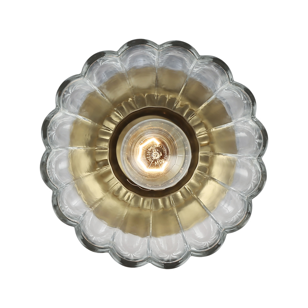 Bring glamorous elegance into your home with the Golden Lighting Audra 1-light 7in Semi-Flush Mount. Featuring a glass shade and a Brushed Champagne Brass frame, it creates a welcoming atmosphere. The clear glass shade offers brilliant, unobstructed light, polished to a high-gloss shine that beautifully highlights the bulb and the fixture's design. It's perfect for spaces that require bright illumination while complementing various styles from industrial to contemporary. The Brushed Champagne Brass finish is an elegant alternative to traditional gold, blending warmth and softness for a chic touch. It's perfect for adding a luxuriously understated aesthetic to your decor. Designed for a blend of style and practicality, this fixture is damp location rated, making it suitable for covered and semi-enclosed spaces with occasional moisture, such as bathrooms and laundry rooms. Requires easy installation and is ideal for mid-height ceilings. Overall Dimensions: 6.88"W x 8"H x 6.88"D. It requires 1 E26 Medium base bulb (not included) with a maximum wattage of 60. Elevate your interior with the lavish allure of the Audra collection!