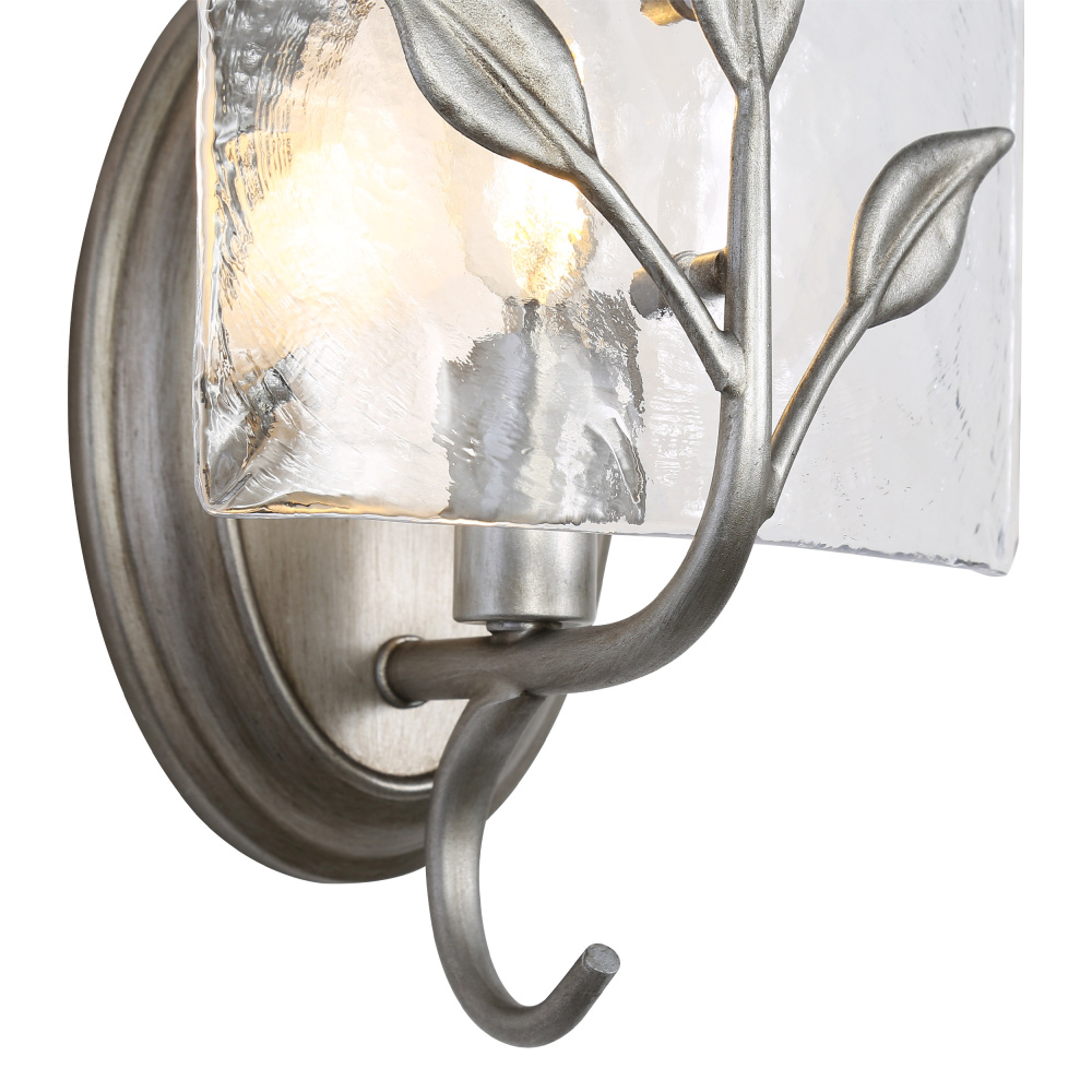 Bring Nature-Inspired elegance into your home with the Golden Lighting Calla 1-light Wall Sconce in Peruvian Silver. Featuring a glass shade and a Peruvian Silver frame, it creates a welcoming atmosphere. The glass shade showcases a Hammered Water Glass design, featuring a heavily textured surface that beautifully distorts and refracts light, creating a dynamic glow that adds artistry and warmth. The Peruvian Silver finish, inspired by handcrafted artisan qualities, offers a muted, weathered silver with warm undertones, enhancing the details with a rich patina. This wall sconce is damp location rated, suitable for covered and semi-enclosed spaces, making it perfect for hallways, bathrooms, and more. With overall dimensions of 6.88"W x 8.75"H x 5.5"D and requiring 1 E12 candelabra base bulb (not included, max 60 watts), it is both stylish and functional. Close with the quality of Golden Lighting's artisanal craftsmanship that brings sophistication to any space.