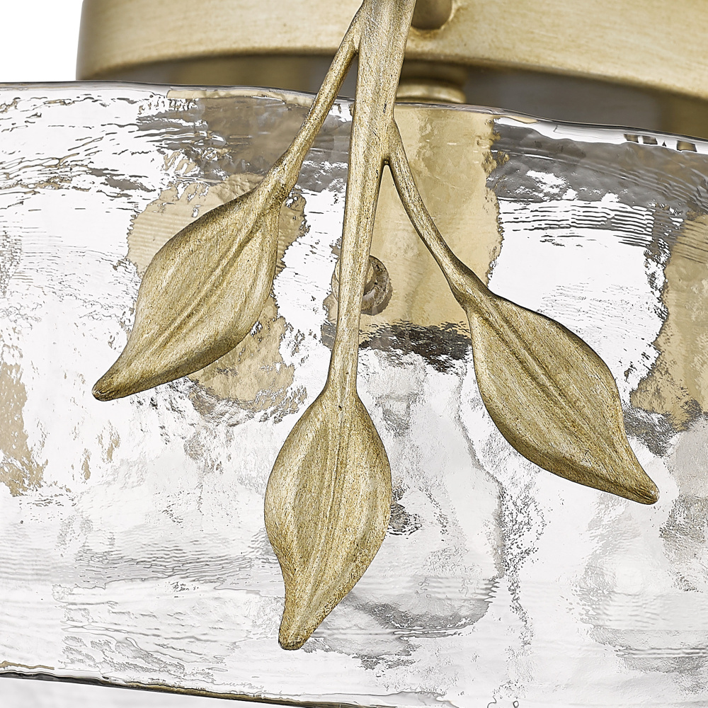 Bring Nature-Inspired elegance into your home with the Golden Lighting Calla 3-light Flush Mount in White Gold. Featuring a glass shade and a White Gold frame, it creates a welcoming atmosphere. This glass shade features Hammered Water Glass, characterized by its heavy, irregular, and organic texture, designed to create a beautifully distorted and refractive light effect. The sophisticated White Gold finish blends the warmth of gold with cool silver tones, offering an understated elegance suitable for any décor. Ideal for low ceilings in hallways, closets, and bathrooms, this fixture is Damp Location Rated, making it suitable for covered and semi-enclosed spaces with occasional moisture. Overall Dimensions: 15.13"W x 7"H x 15.13"D, requires 3 E26 Medium base bulbs (not included), max wattage 100 per bulb. Elevate your space with this artisanal lighting option that beautifully reflects quality and craftsmanship.