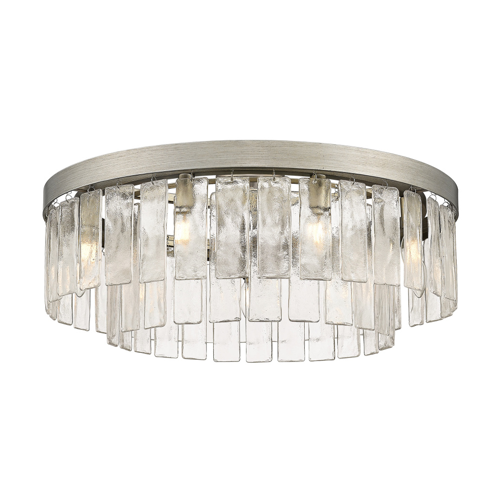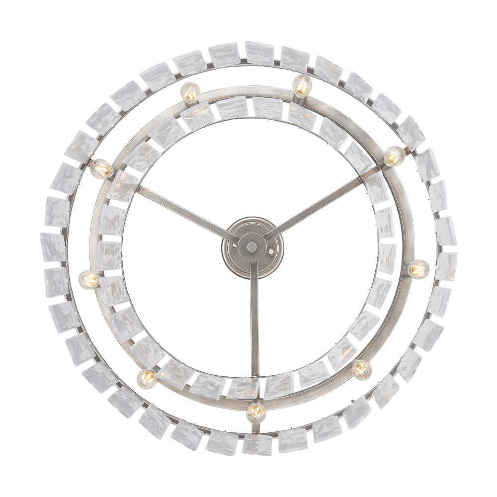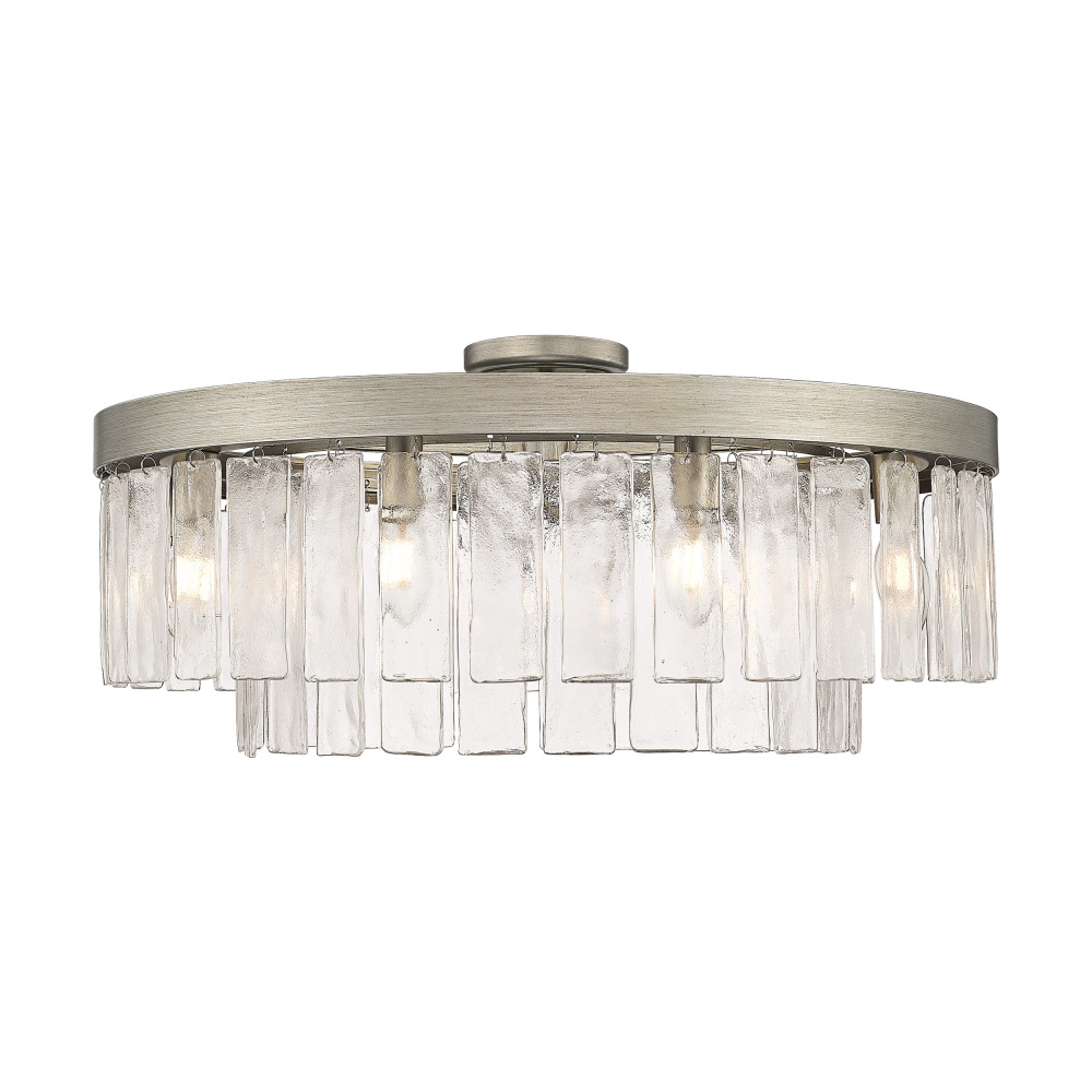 Bring Glam elegance into your home with the Golden Lighting Ciara 9-light Semi-Flush Mount. Featuring a glass shade and a Peruvian Silver frame, it creates a welcoming atmosphere. The hammered water glass shade, with its unique textured finish, captures and refracts light beautifully, adding depth and charm to your decor. The Peruvian Silver finish, hand-brushed to create rustic texture and subtle patina, enhances the fixture's artisanal quality, making it a perfect centerpiece. Ideal for spaces with mid-height ceilings, this fixture is damp location rated for safe use in areas with occasional moisture. Its convertible construction allows for versatile installation, adapting easily for various ceiling heights. Dimensions measure 27"W x 11"H x 27"D, and it requires 9 E12 Candelabra base bulbs (not included) with a maximum wattage of 60 per bulb. Elevate your home's ambiance with this exquisite fixture that seamlessly combines functionality and beauty.