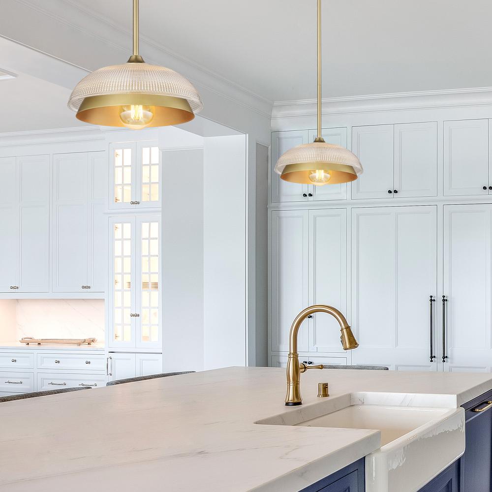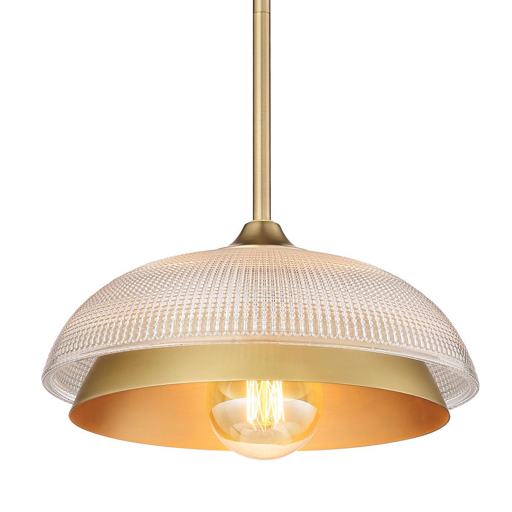 Bring timeless elegance into your home with the Golden Lighting Crawford 1-light Pendant. Featuring a glass shade and a Brushed Champagne Brass frame, it creates a welcoming atmosphere. The Retro Prism glass shade features a grid-like prismatic texture designed to create a brilliant, refractive light effect. This high-quality glass transforms illumination into a vibrant display, adding retro glamour to any space. With its stunning Brushed Champagne Brass finish, this pendant light offers an understated and elegant glow. It's perfect for adding a touch of quiet luxury to your interiors. Ideal for kitchens, dining rooms, and entryways, this fixture is Damp Location Rated and suitable for semi-enclosed spaces. The sloped-ceiling compatibility allows for effortless installation, and the adjustable height ranges from 15" to 51". Overall Dimensions: 11.75"W x 9"H x 11.75"D. Requires 1 E26 Medium base bulb (not included), with a maximum wattage of 100. Close your eyes and envision this captivating light transforming your space into a haven of sophistication and style, showcasing quality craftsmanship and artistic design.