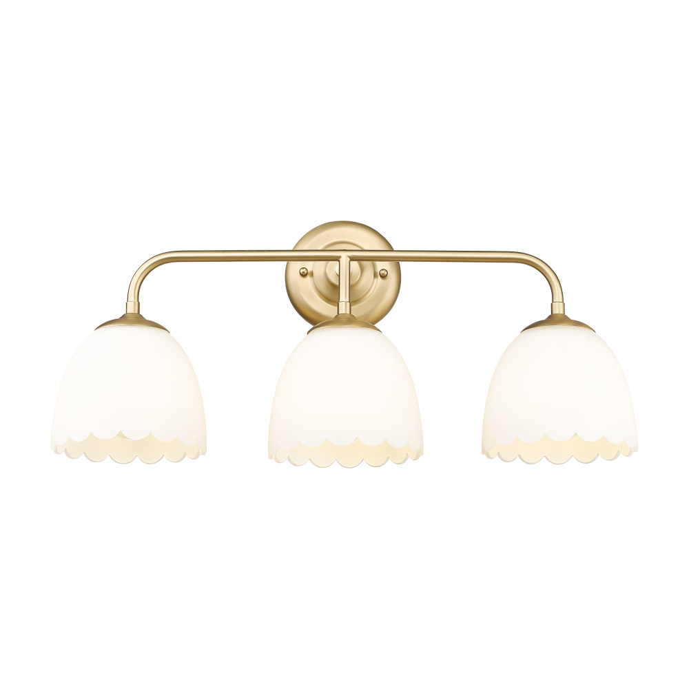 Bring traditional elegance into your home with the Golden Lighting Dorinda 3-light Vanity in Brushed Champagne Brass. Featuring a glass shade and a brushed champagne brass frame, it creates a welcoming atmosphere. The opal glass shade diffuses light evenly, delivering a soft, glare-free glow that enhances the space. The chic finish, a blend of warmth and softness, provides a touch of quiet luxury to your interior. Perfect for bathrooms, this light is damp location rated, suitable for covered and semi-enclosed spaces, like bathrooms and laundry rooms. Requires 3 E26 medium base bulbs (not included) with a maximum wattage of 100. Overall dimensions are 24.5"W x 11"H x 7.5"D. Upgrade your home with quality and stylish lighting that complements your decor.