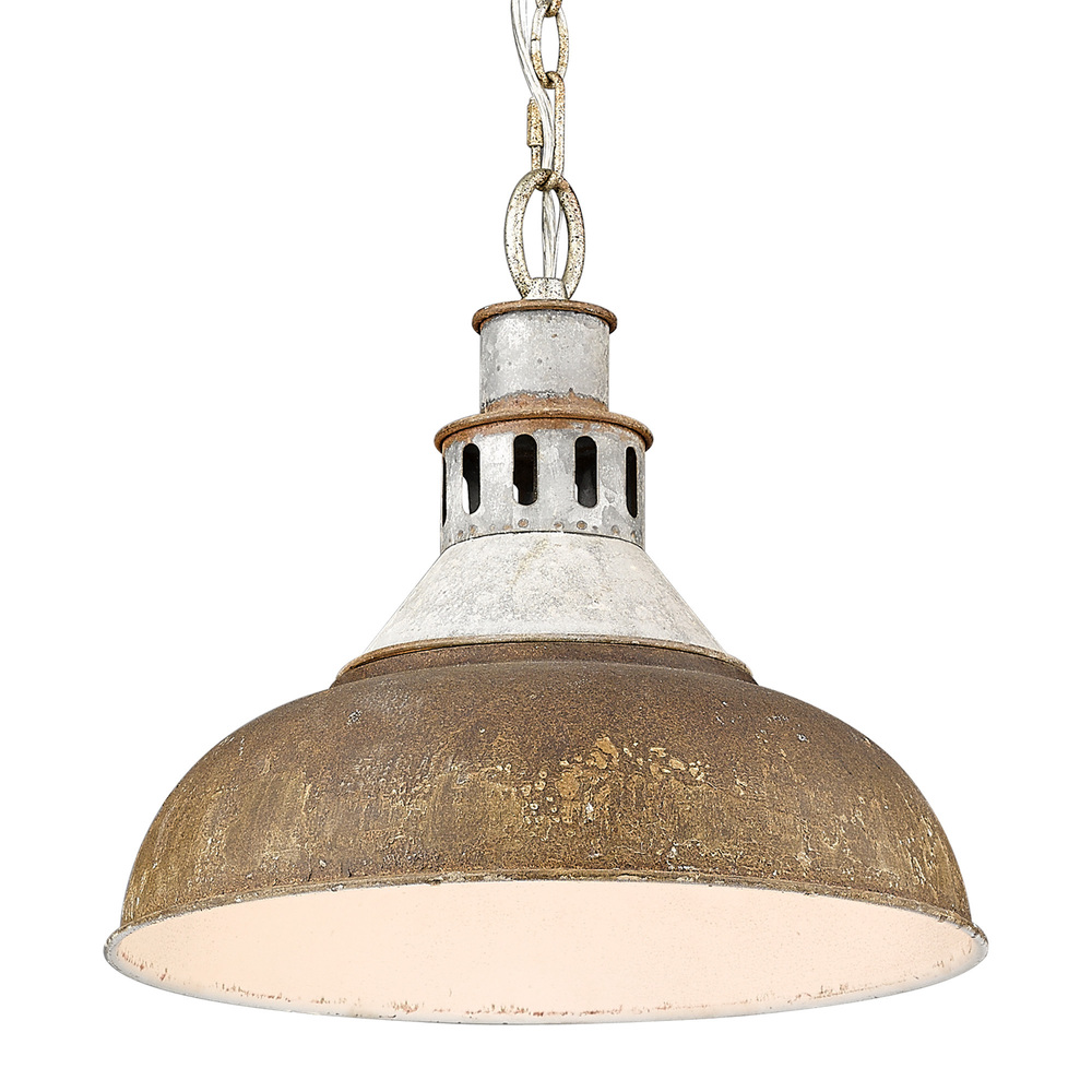Bring farmhouse elegance into your home with the Golden Lighting Kinsley 1-light Pendant in Antique Rust shade. Featuring a metal shade and a rugged aged galvanized steel frame, it creates a welcoming atmosphere. The metal shade showcases a stunning antique rust finish, featuring a heavily distressed, multi-layered look. The matte reddish-brown top coat is artfully aged to reveal a warm, antique gold leaf base beneath, enhancing the rustic character and texture of your space. Crafted with an aged galvanized steel that tells a powerful story of time, this finish mimics the deep granules of corrosion while adding artistic value. Suitable for covered and semi-enclosed spaces, the Kinsley pendant is perfect for bathrooms, porches, and laundry rooms. Easily install on angled ceilings and customize the hanging length from 16.75" to 88.75" for versatile design options. Overall, it measures 14"W x 13.38"H x 14"D and requires 1 E26 Medium base bulb (not included), with a maximum wattage of 100 for focused illumination. Embrace the charm and quality of the Kinsley pendant, making it a quintessential addition to any rustic or contemporary home.