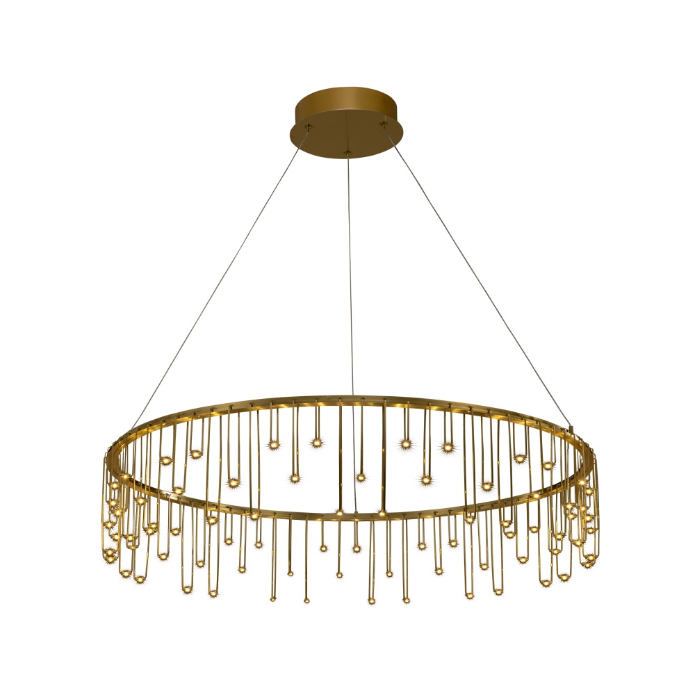 Bring modern elegance into your home with the Golden Lighting Lucerna Integrated LED 32in Chandelier. Featuring a stunning Stainless Steel Gold frame, it creates a welcoming atmosphere. This chandelier, with no shade, presents an avant-garde melting effect crafted from stainless steel that dissolves into delicate prongs, achieving the pinnacle of contemporary design. Experience the quality of the Stainless Steel Gold finish, which is both durable and visually striking, featuring a warm layer of electroplated gold combined with a fine, brushed texture. Ideal for dining rooms, foyers, and other indoor spaces, this fixture is dry location rated and sloped-ceiling compatible, allowing for adjustable height (Min: 9.375", Max: 129.375") to customize your space. Overall Dimensions: 31.5"W x 6.88"H x 31.5"D. Equipped with integrated LED technology, this chandelier provides 2809 lumens of warm illumination at 3000K. Elevate your home with this stylish and durable piece that embodies modern luxury.