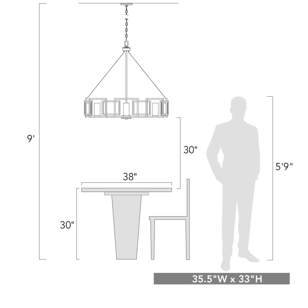 Bring modern elegance into your home with the Golden Lighting Marco 8-light Chandelier. Featuring a glass shade and a brushed champagne brass frame, it creates a welcoming atmosphere. The clear glass shade offers a brilliant, unobstructed light, perfectly complementing the intricate, open-frame geometric design of the chandelier. This timeless glass allows the beauty of the bulb to shine and enhances the fixture's modern appeal. The brushed champagne brass finish is the epitome of sophistication, providing a chic and versatile look that adds a touch of luxury to your space. Ideal for indoor use in dry locations, this fixture is perfect for dining rooms, living spaces, or hallways. It is sloped-ceiling compatible and adjustable in height, allowing for an optimal fit in various room settings. The hanging length can be customized from a minimum of 37" to a maximum of 106". Overall dimensions are 35.38"W x 32.75"H x 35.38"D, and it requires 8 E12 candelabra base bulbs (not included), with a maximum wattage of 60 per bulb. Transform your space with this gorgeous chandelier that delivers bright light and a stunning design, reflecting modern elegance and quality craftsmanship.