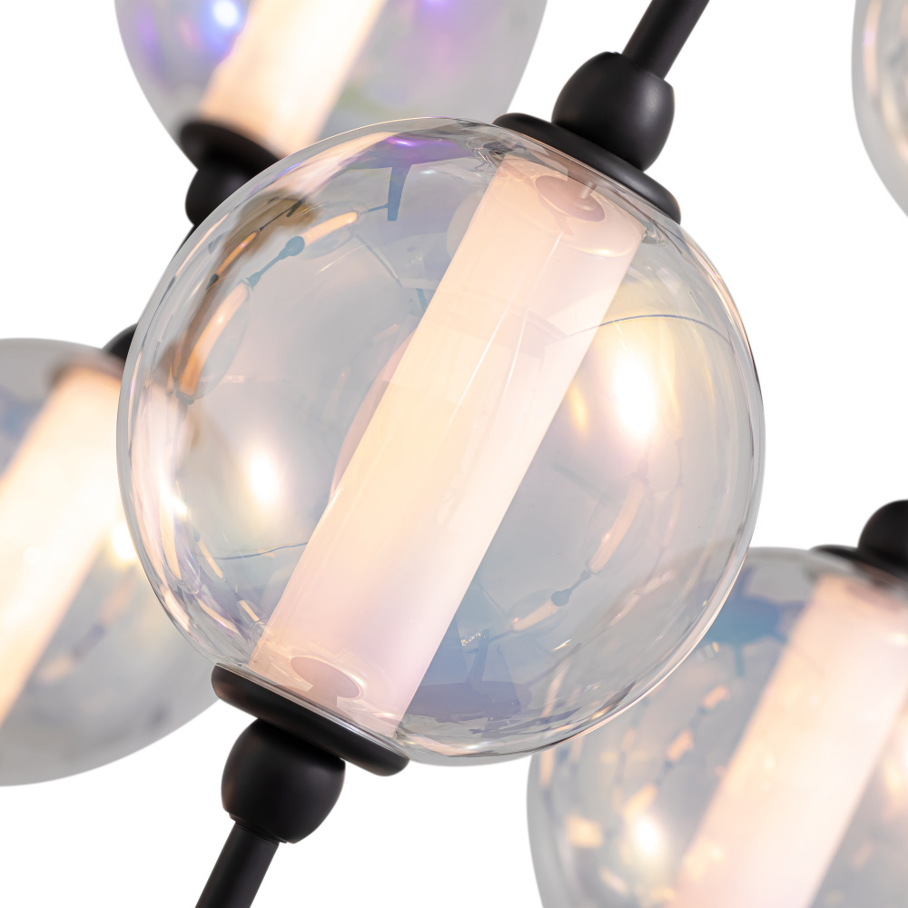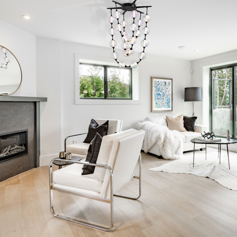 Indulge in luxurious style with the Golden Lighting Pearla Integrated LED 28in Pendant. Featuring a glass shade and a matte black frame, it creates a welcoming atmosphere. The iridescent glass shade adds a dazzling touch, reminiscent of pearls catching sunlight, ensuring a stunning visual display that shifts with the light. With a timeless matte black finish, this pendant absorbs light beautifully, making it the perfect foundational fixture for any decor. Ideal for kitchens, dining rooms, or bedrooms, it is rated for dry locations, ensuring safe use in indoor spaces. Effortlessly install this pendant with included mounting hardware and enjoy the energy-efficient illumination from the integrated LED technology providing 3483 lumens with a warm 3000K glow. Overall Dimensions: 28.25"W x 40.5"H x 28.25"D. Bring sophistication to your space with the Golden Lighting Pearla pendant, designed for quality living.