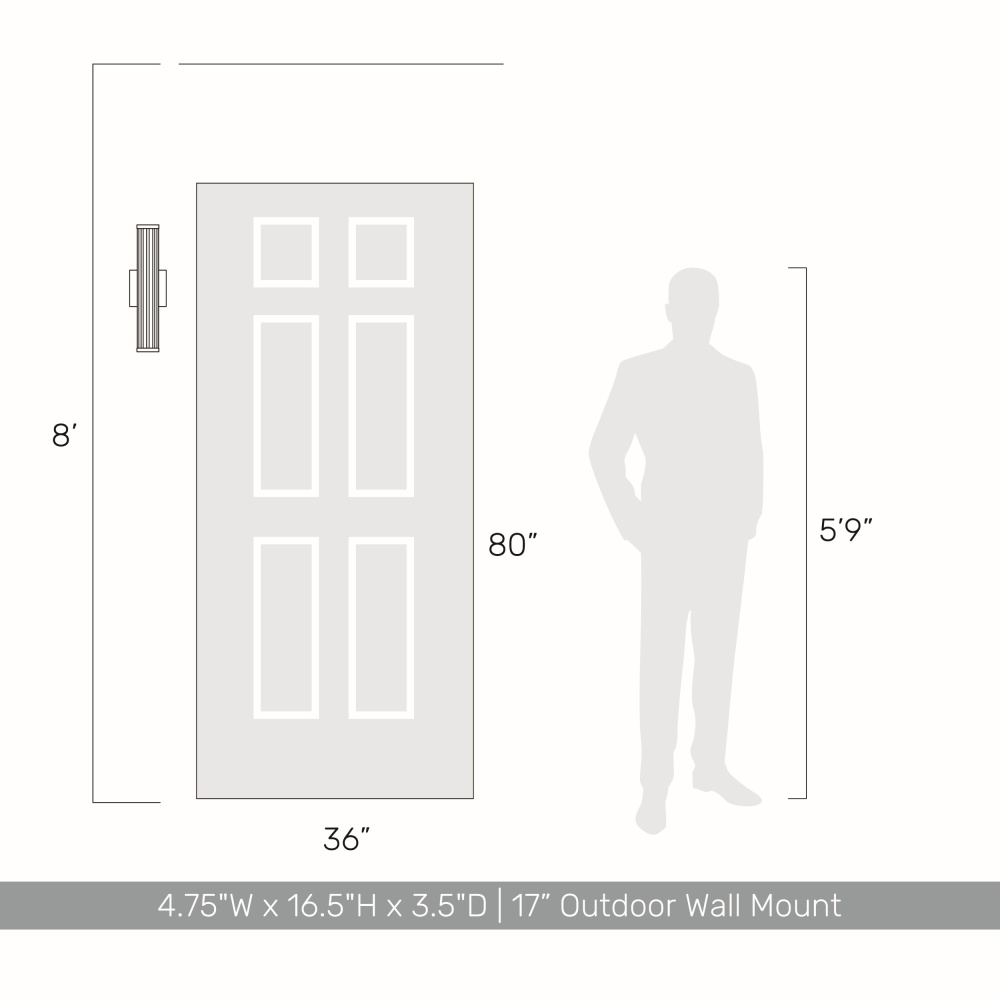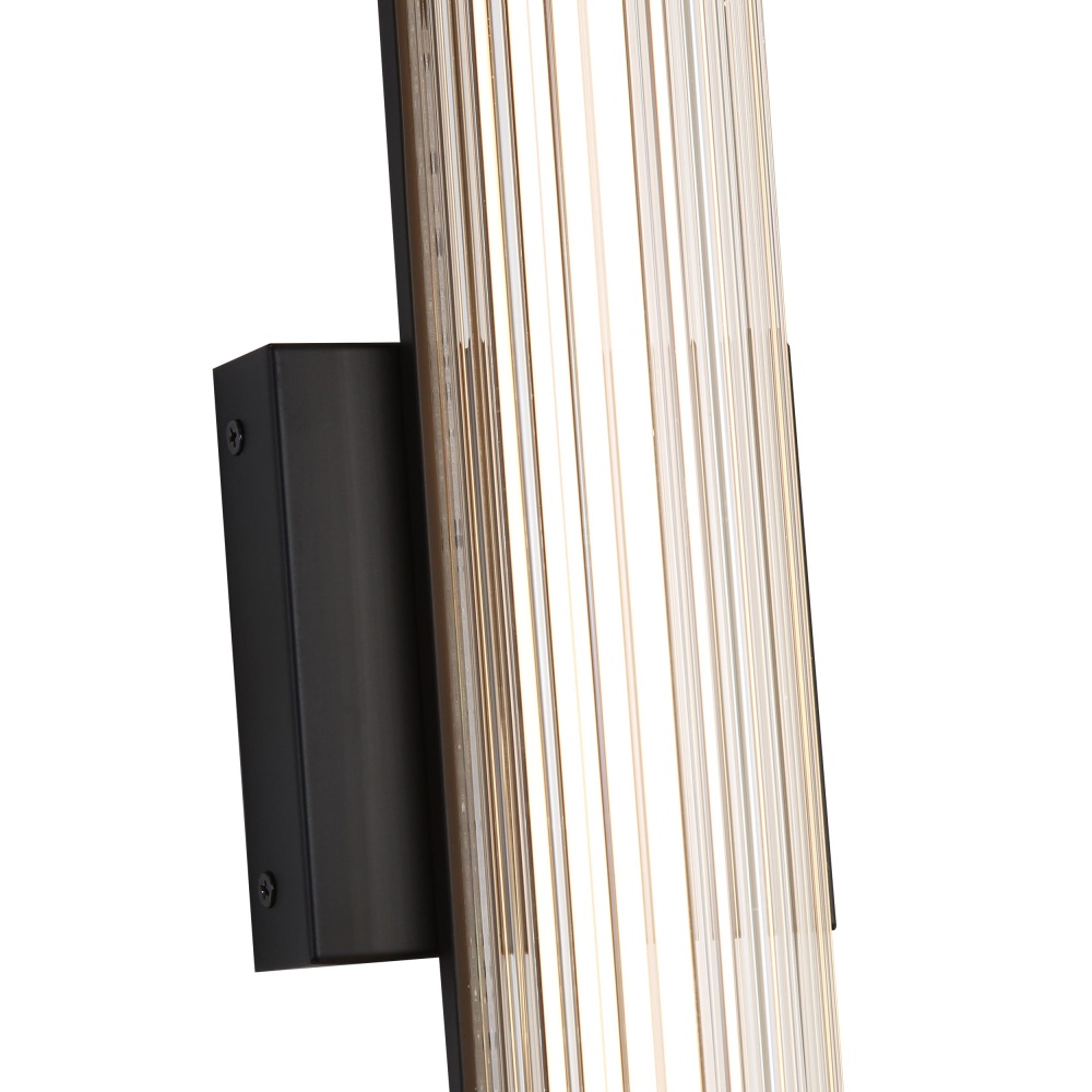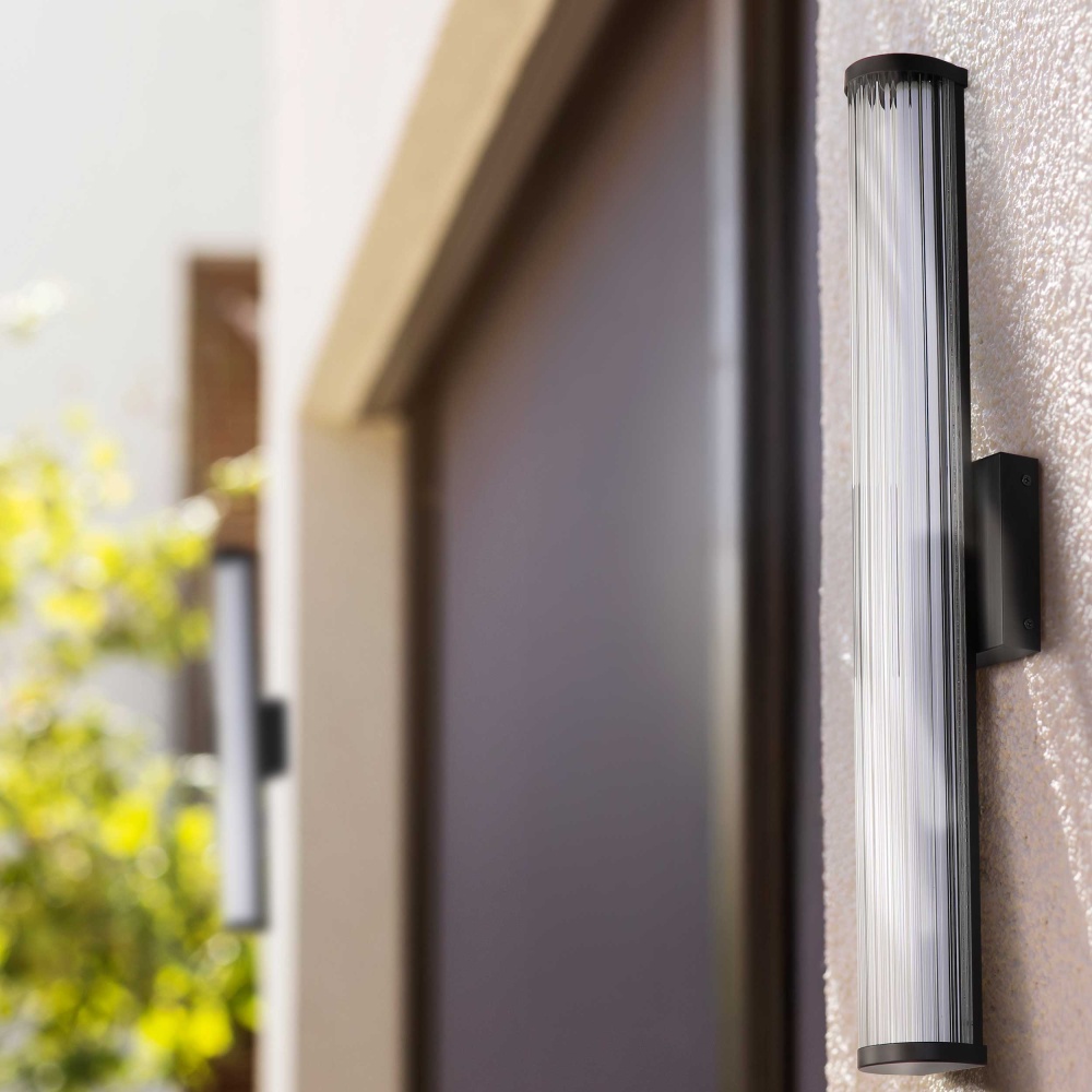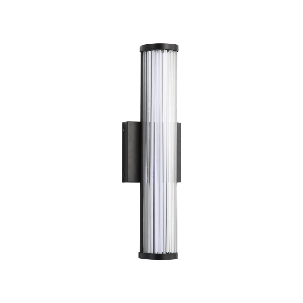 Bring modern elegance into your home with the Golden Lighting Rodara Integrated LED 17in Outdoor Wall in Matte Black. Featuring a glass shade and a matte black frame, it creates a welcoming atmosphere. The clear ribbed glass shade provides unobstructed light with a glossy finish, distinguished by fine, vertical ribs that refract light beautifully. This fixture offers a clean and timeless appeal, making it suitable for a wide array of styles. The matte black finish epitomizes clean, modern style, complementing virtually any decor from minimalist to contemporary. Functional and inviting at entryways, patios, and garage doors, it's wet location rated for direct exposure to rain, snow, and other elements. Designed for durability, it’s made from powder-coated aluminum, ensuring a high-quality finish. Overall Dimensions: 4.75"W x 16.5"H x 3.5"D with integrated LED technology that provides 1440 rated lumens and a warm 3000K glow. Elevate your outdoor space with this blend of style, quality, and functionality.