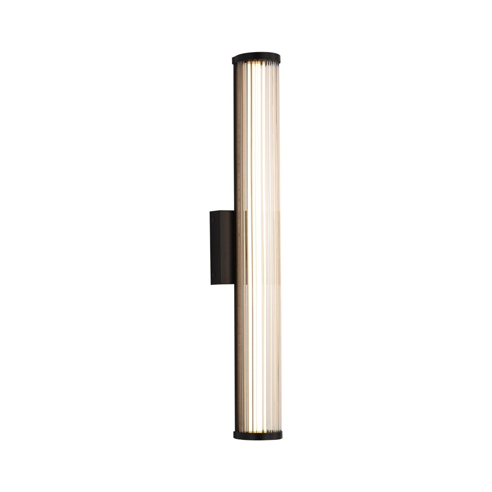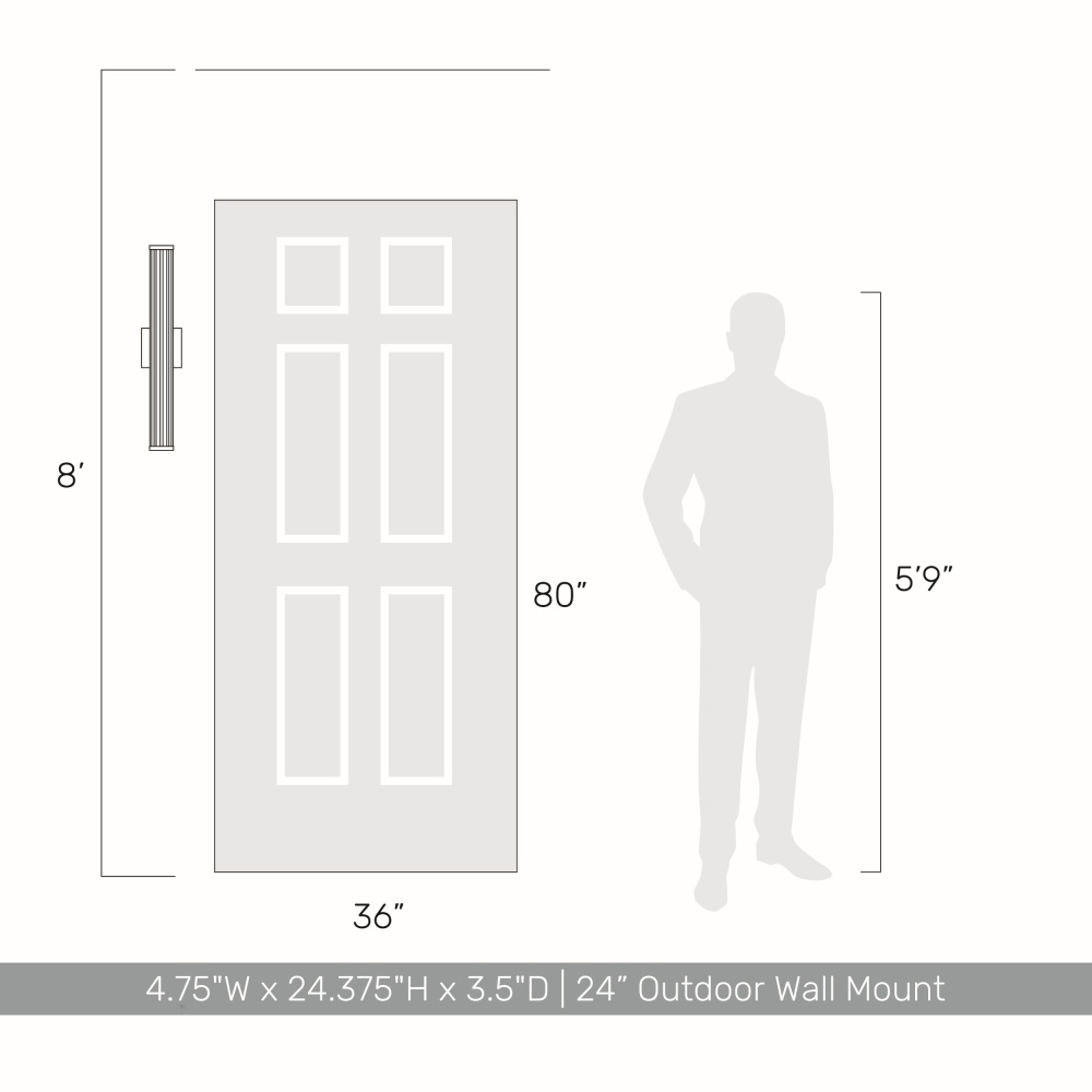 Bring modern elegance into your home with the Golden Lighting Rodara Integrated LED 24in Outdoor Wall in Matte Black. Featuring a glass shade and a matte black frame, it creates a welcoming atmosphere. The clear ribbed glass shade offers unobstructed light and a glossy finish, marked by fine, vertical ribs that refract light beautifully. This fixture delivers a timeless appeal suitable for various styles, from modern to industrial. The matte black finish exemplifies clean, contemporary style, making it perfect for any setting. The fixture is functional and inviting at entryways, patios, and garage doors with a wet location rating that withstands direct exposure to the elements. Built from durable powder-coated aluminum, it ensures a long-lasting finish. Overall Dimensions: 4.75"W x 24.38"H x 3.5"D with integrated LED technology providing 2400 rated lumens and a warm glow at 3000K. Upgrade your outdoor environment with a blend of refinement and functionality.