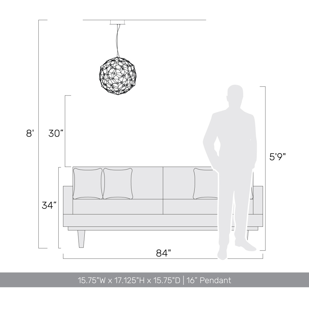 Bring luxurious elegance into your home with the Golden Lighting Spheris Integrated LED 16in Pendant. Featuring a stunning Natural Brass frame, it creates a welcoming atmosphere. Crafted from genuine solid brass, this pendant showcases a beautiful spherical form filled with dazzling LED lights. Its modern finish and refined texture elevate any space, while the lighting creates a luxurious display effect that transforms its environment. Perfect for kitchens, dining rooms, or entryways, this Dry Location Rated light fixture is an exceptional choice for indoor spaces not exposed to moisture. Its adjustable height feature allows for versatility in hanging, accommodating between 20" and 139.5". Overall Dimensions: 15.75"W x 17.13"H x 15.75"D Integrated LED Technology provides brilliant, energy-efficient illumination with a long-lasting, dimmable light source offering 1944 rated lumens at a 3000K CCT for a warm glow. Enhance your living space with this elegant pendant, designed to impress while maintaining unmatched quality.