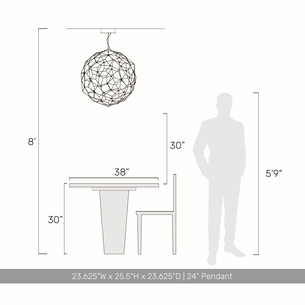 Bring modern glam elegance into your home with the Golden Lighting Spheris Integrated LED 24in Pendant. Featuring stunning integrated LED technology and a natural brass frame, it creates a welcoming atmosphere. The spherical design features dazzling LED lights, providing a luxurious and dramatic display that transforms any space. Crafted from genuine solid brass, the timeless natural brass finish celebrates the authentic beauty and warmth of the material, enhancing your décor over time. Perfect for a variety of settings, this pendant is dry location rated, making it ideal for bedrooms, living rooms, and hallways. Easily installable on sloped ceilings, it features an adjustable height ranging from 28.5" to 147.75". With overall dimensions of 23.63"W x 25.5"H x 23.63"D, this pendant utilizes integrated LED technology, delivering 1944 rated lumens and a cozy 3000K warm glow. Elevate your space with the sophisticated quality and timeless charm of the Golden Lighting Spheris Pendant.