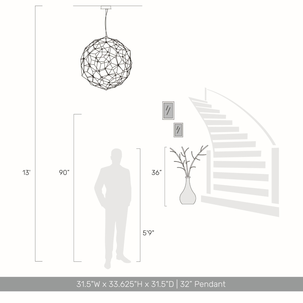 Bring modern glam elegance into your home with the Golden Lighting Spheris Integrated LED 32in Pendant. Featuring impressive integrated LED technology and a natural brass frame, it creates a welcoming atmosphere. Showcasing a dazzling array of LED lights in a striking spherical design, this pendant adds a luxurious touch to any room. Crafted from solid brass, the natural brass finish will develop a unique patina over time, adding character and warmth to your home. Ideally suited for dry locations, this fixture enhances bedrooms, dining rooms, and overall living areas. It's designed for easy installation on sloped ceilings and offers an adjustable height between 36.5" and 156". With overall dimensions of 31.5"W x 33.63"H x 31.5"D, enjoy powerful illumination with integrated LED technology providing 1944 rated lumens and a cozy 3000K temperature. Elevate your living space with the timeless sophistication of the Golden Lighting Spheris Pendant.