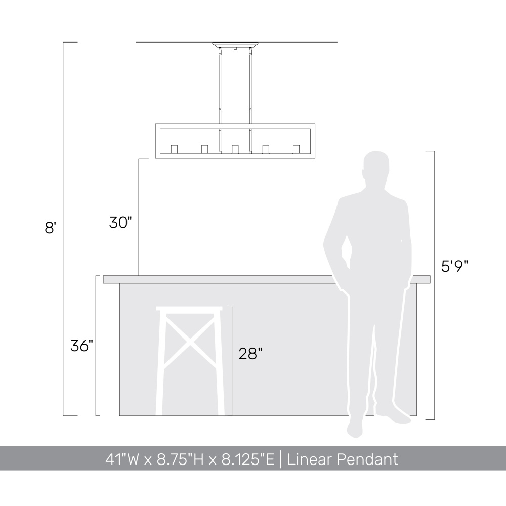 Bring transitional elegance into your home with the Golden Lighting Sutton 5-light Island Light in Matte Black. Featuring a sleek design and a matte black frame, it creates a welcoming atmosphere in your kitchen or dining area. This fixture enhances your space with its stylish open-box structure that showcases the beauty of the bulbs. Crafted without a shade, it allows for a direct light effect that is both bright and inviting. The matte black finish is timeless and versatile, offering a smooth touch and a rich, non-reflective surface that complements various decor styles. Tailored for kitchen islands, this island light is dry location rated, making it ideal for indoor spaces not subject to moisture. It's sloped-ceiling compatible and offers adjustable height, ranging from 16.5" to 46.25", allowing you to customize the fixture to suit your design needs. Overall Dimensions: 41"W x 8.75"H x 8.13"D. Requires five E26 medium base bulbs (not included), with a maximum wattage of 60 per bulb. Elevate your décor and enjoy this quality lighting piece that seamlessly combines functionality and style.