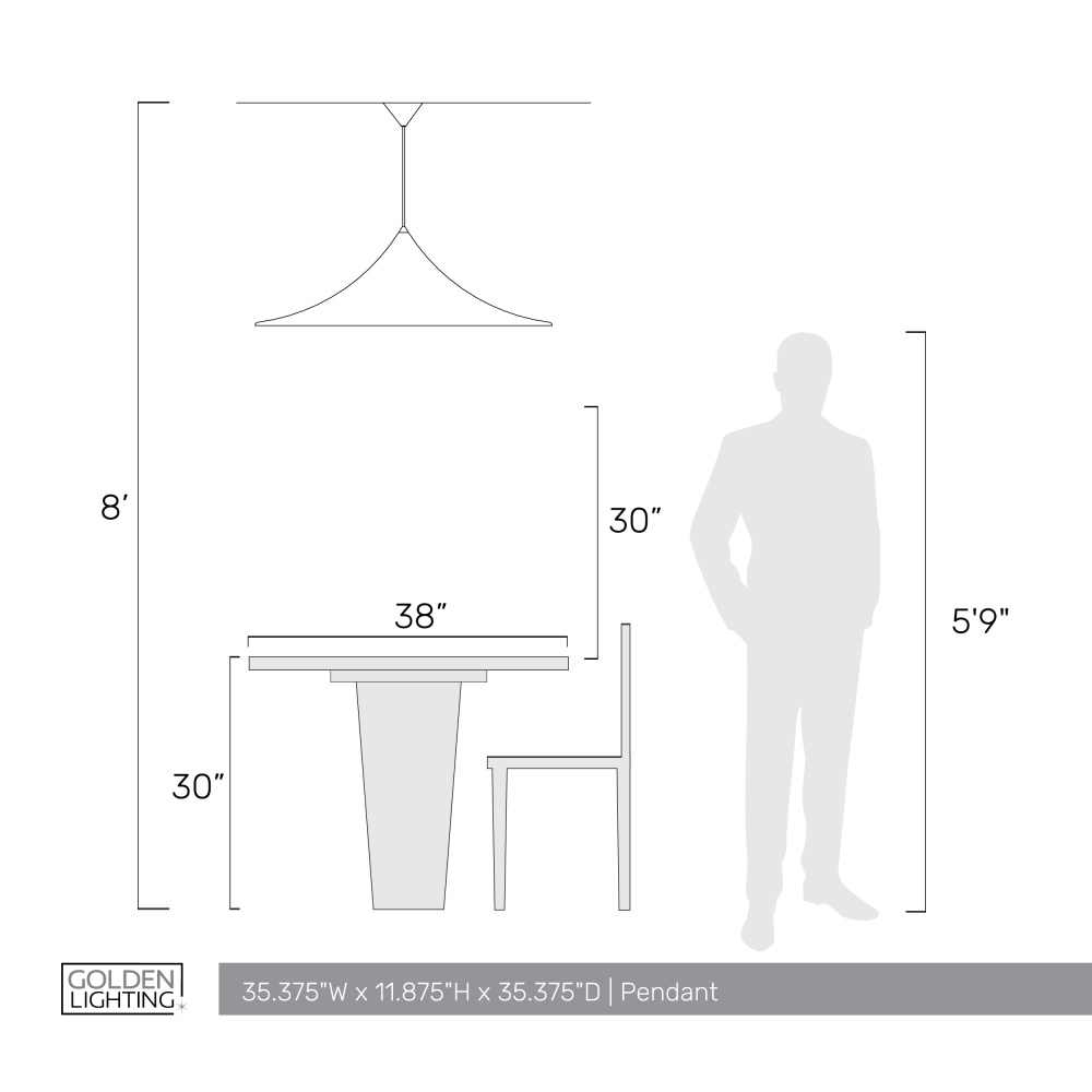 Bring elegant warmth into your home with the Golden Lighting Vistara 1-light 35in Pendant in Latte. Featuring a metal shade and a Latte frame, it creates a soothing ambiance. This pendant's creamy light brown-beige hue has a velvety, non-reflective matte surface that beautifully absorbs light, making it a sophisticated choice for modern decor. Add a stylish statement to kitchens, dining rooms, or bedrooms — perfect for focused yet decorative illumination in entryways, foyers, and even bathrooms. Dry Location Rated: Ideal for indoor spaces not subject to moisture. Easily install on angled ceilings and adjust the hanging length from a minimum of 14.625" to a maximum of 134.625". Overall Dimensions: 35.38"W x 11.88"H x 35.38"D and requires 1 E26 Medium base bulb (not included, max 60 wattage). Each pendant is carefully crafted for a flawless finish, ensuring quality and aesthetic appeal in any space.