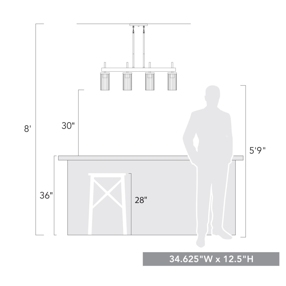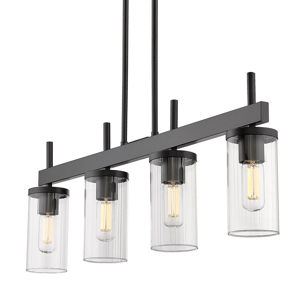Discover modern sophistication with the Golden Lighting Winslett 4-light Island Light in Matte Black. Its clear glass shades and matte black frame offer a perfect blend of utility and style for any kitchen island. The clear glass shade showcases a unique ribbed texture that refracts light beautifully, creating a warm, inviting glow. Our matte black finishing creates an understated elegance, making it an ideal choice that complements a range of decor styles from industrial to contemporary. Designed for kitchen islands, this dry location rated fixture is ideal for use in areas not subject to moisture, while also being adjustable and compatible with sloped ceilings. Overall Dimensions: 34.63"W x 12.5"H x 4"D. Requires 4 E26 medium base bulbs (not included), max 60 wattage per bulb. Enhance your home with a fixture that brings both illumination and a polished aesthetic.