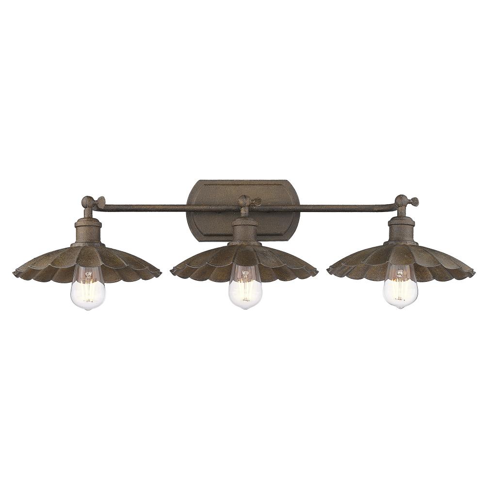 Upgrade your bathroom with the Wry Lighting Clemence 3-light Vanity in Dark Rust. This fixture seamlessly integrates farmhouse aesthetics with modern functionality, featuring three metal shades and a dark rust frame. The metal shades offer a chic design while providing warm, inviting light that enhances your grooming experiences. Its texture and deep coloration, complemented by coppery-orange flecks, create a rustic ambiance that transforms any space. This vanity light is damp location rated, making it suitable for areas prone to moisture, like bathrooms or covered porches. The adjustable directional heads provide flexibility to shine light exactly where you need it, enhancing the usability of your space. Overall Dimensions: 30.88"W x 7.13"H x 10.13"D. Requires 3 E26 Medium base bulbs (not included, max 100 watt). This product showcases quality craftsmanship along with a unique aesthetic that elevates your every day.