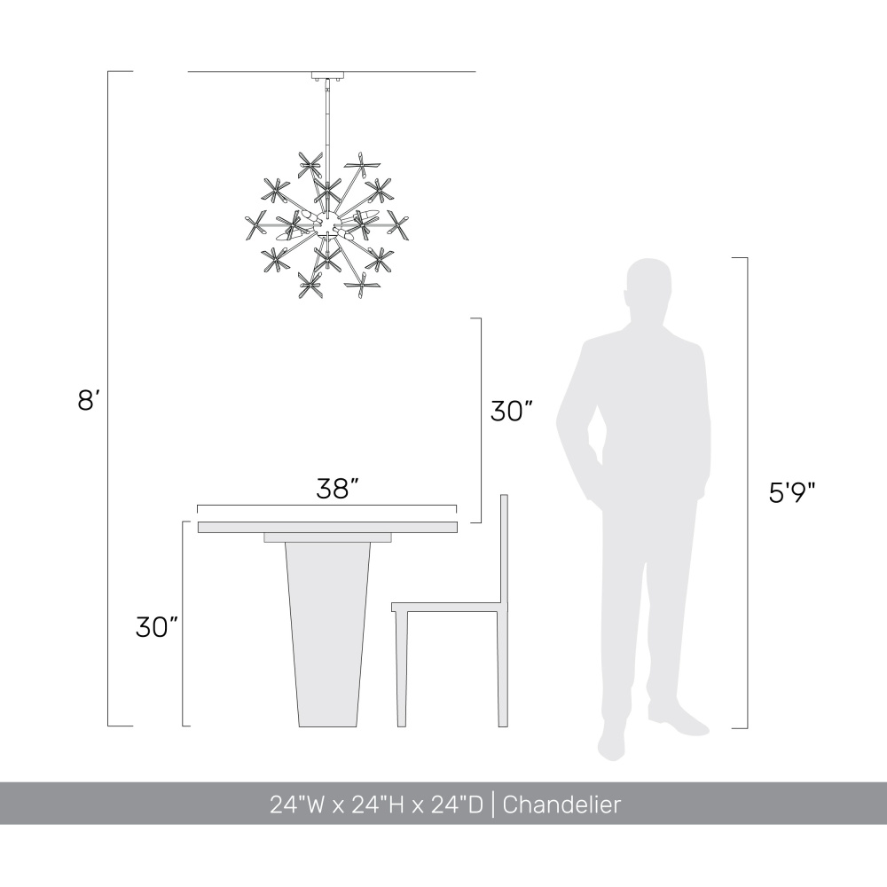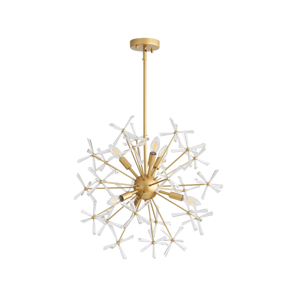 Bring glam elegance into your home with the Wry Lighting Dandelion 6-light Pendant in Matte Gold. Without any shade, this piece is designed to create a breathtaking lighting display. An explosion of crystal-like rods comes together to form a luxurious starburst effect, reflecting light from every angle to fill your space with sparkle and glamor, perfect for making a statement. The Matte Gold finish provides a warm and sophisticated glow with its soft satin lustre that diffuses light gently, avoiding harsh glares while adding refined texture. Ideal for dry conditions, this pendant is perfect for indoor spaces, including kitchens, dining rooms, and bedrooms. It is easily adjustable in height and compatible with sloped ceilings for a custom fit. Overall dimensions are 24"W x 24"H x 24"D, and it requires 6 E12 Candelabra base bulbs (not included), max 60 wattage per bulb. Add a touch of luxurious charm and an opulent statement piece to your home with this striking fixture.