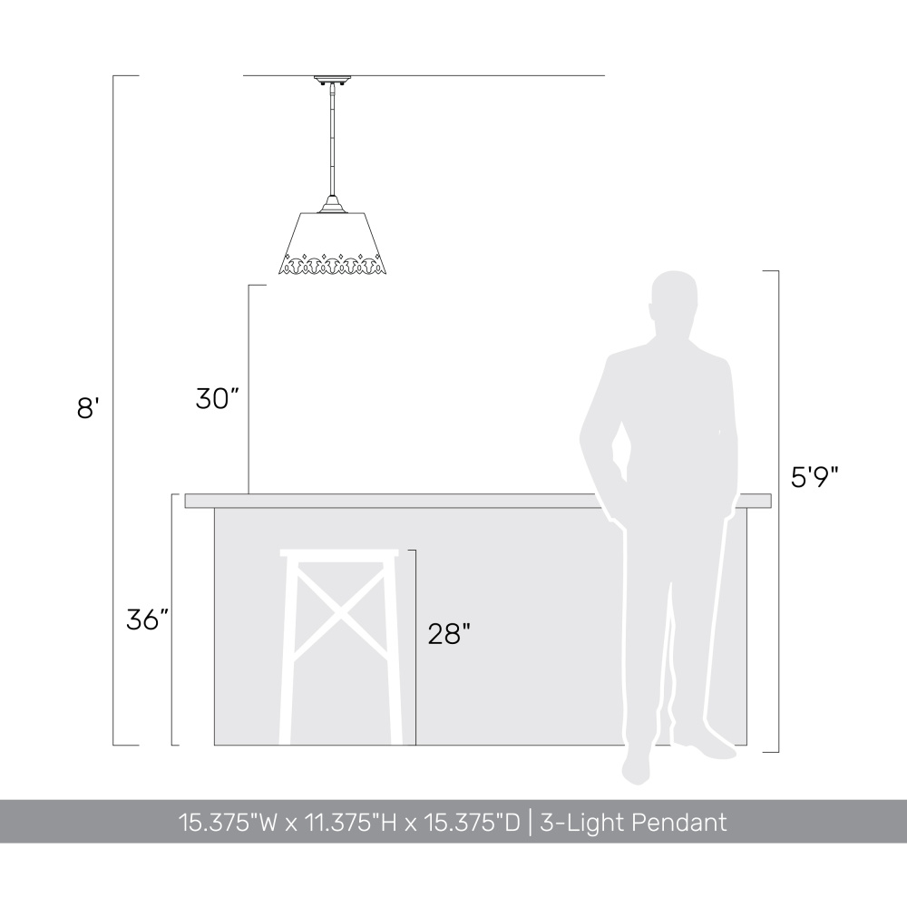 Bring farmhouse elegance into your home with the Wry Lighting Eloise 3-light Pendant in Antique Ivory. Featuring a metal shade and an Antique Ivory frame, it creates a welcoming atmosphere. This metal shade, finished in a creamy, off-white base accentuated by a distressed, cracked texture, allows light to dance beautifully across your space. The finish, artfully aged with a dark patina, enriches the charm by revealing glints of a warm, gilded underlayer, ensuring each piece is unique. Ideal for dry locations, this pendant light is perfect for kitchens, dining rooms, or bedrooms, providing focused yet decorative illumination. Its sloped-ceiling compatibility and adjustable height options (14"-56.125") make installation easy in diverse spaces. Overall Dimensions: 15.38"W x 11.25"H x 15.38"D. Requires 3 E26 Medium base bulbs (not included), with a maximum of 60 watts per bulb. Elevate your home with the timeless craftsmanship and quality of this exquisite lighting fixture.