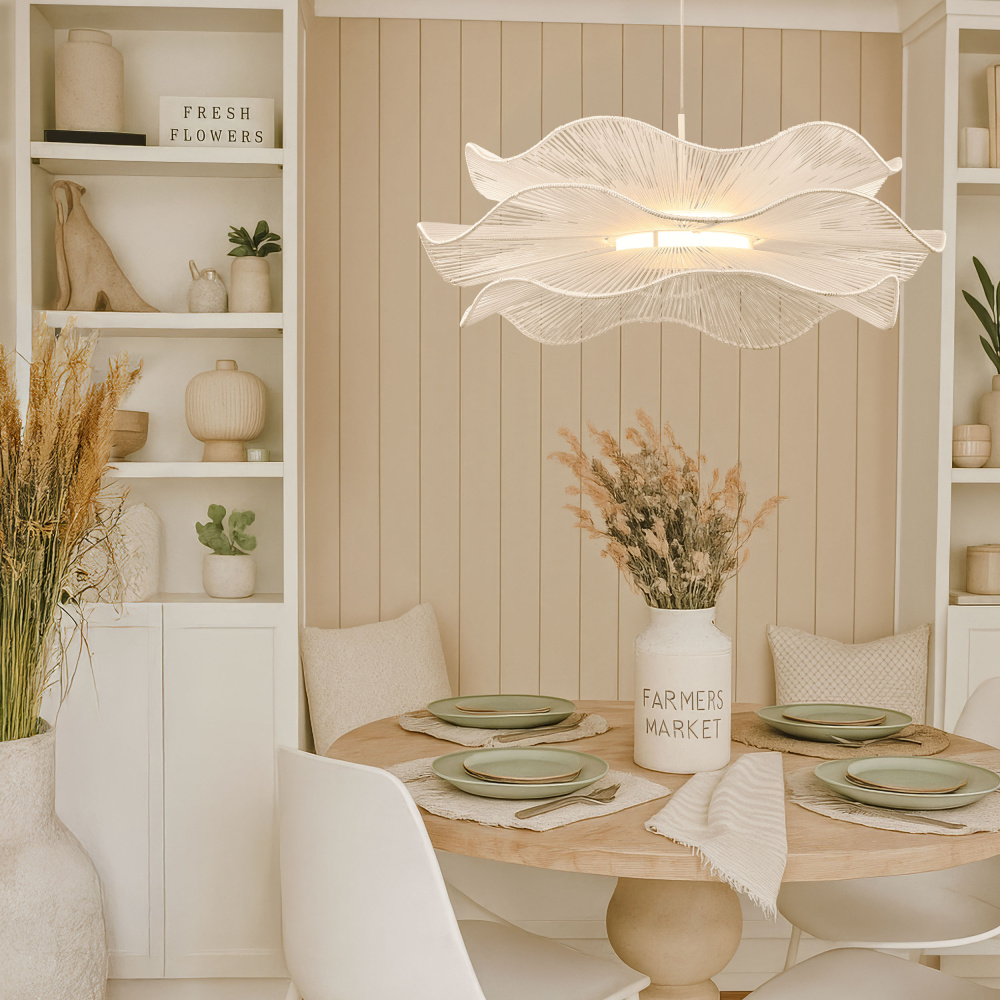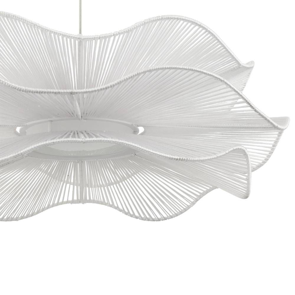 Bring nature-inspired elegance into your home with the Wry Lighting Whisper Integrated LED Pendant in Matte White. Featuring a rope shade and a white frame, it creates a welcoming atmosphere. The matte white shade is smooth and non-reflective, enhancing the light's absorption for an understated look. This minimalist design is perfect for kitchens, dining rooms, and bedrooms, providing focused yet decorative illumination in entryways, foyers, and bathrooms. Dry Location Rated: Ideal for indoor spaces not subject to moisture. Sloped-Ceiling Compatible and Adjustable Height: Easily install on angled ceilings and customize the hanging length from 30" to 123". Overall Dimensions: 23.63"W x 8.5"H x 23.63"D. Integrated LED Technology offers 900 rated lumens at a warm 3000K glow. Experience the blend of style and functionality with a fixture that reflects quality and modernity.