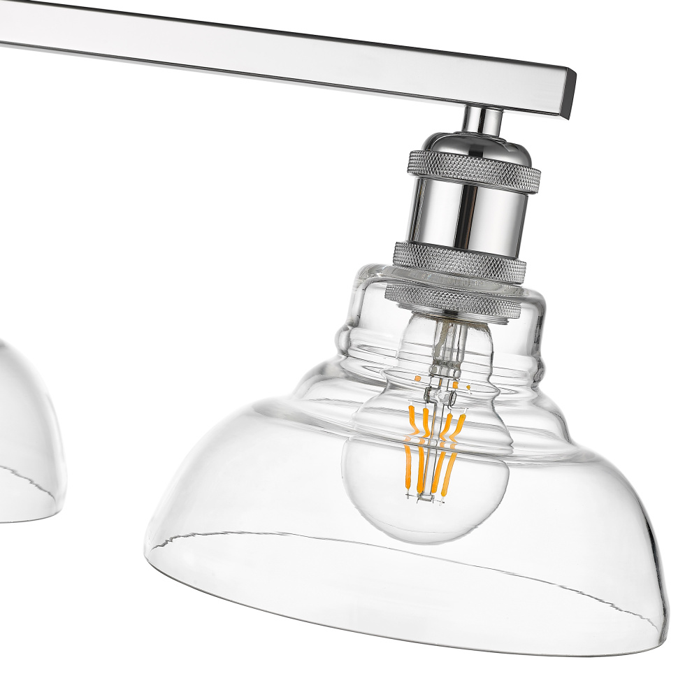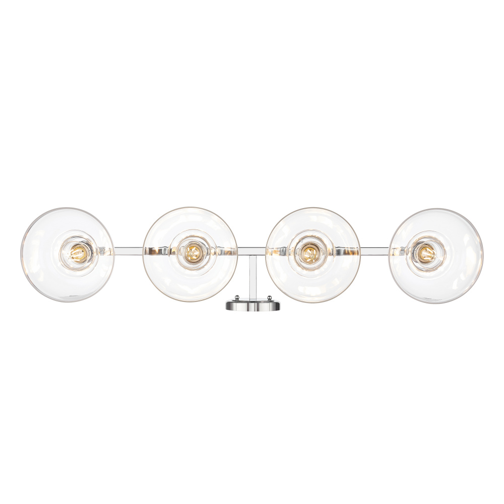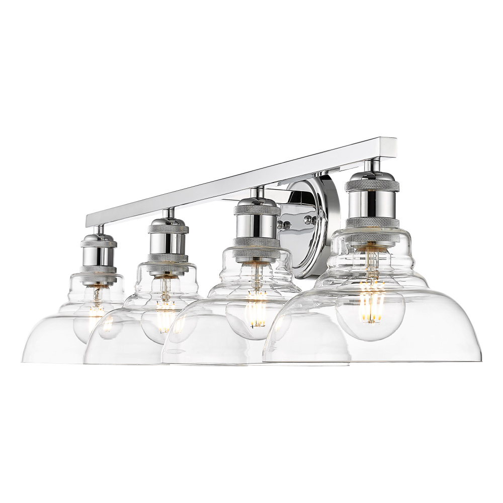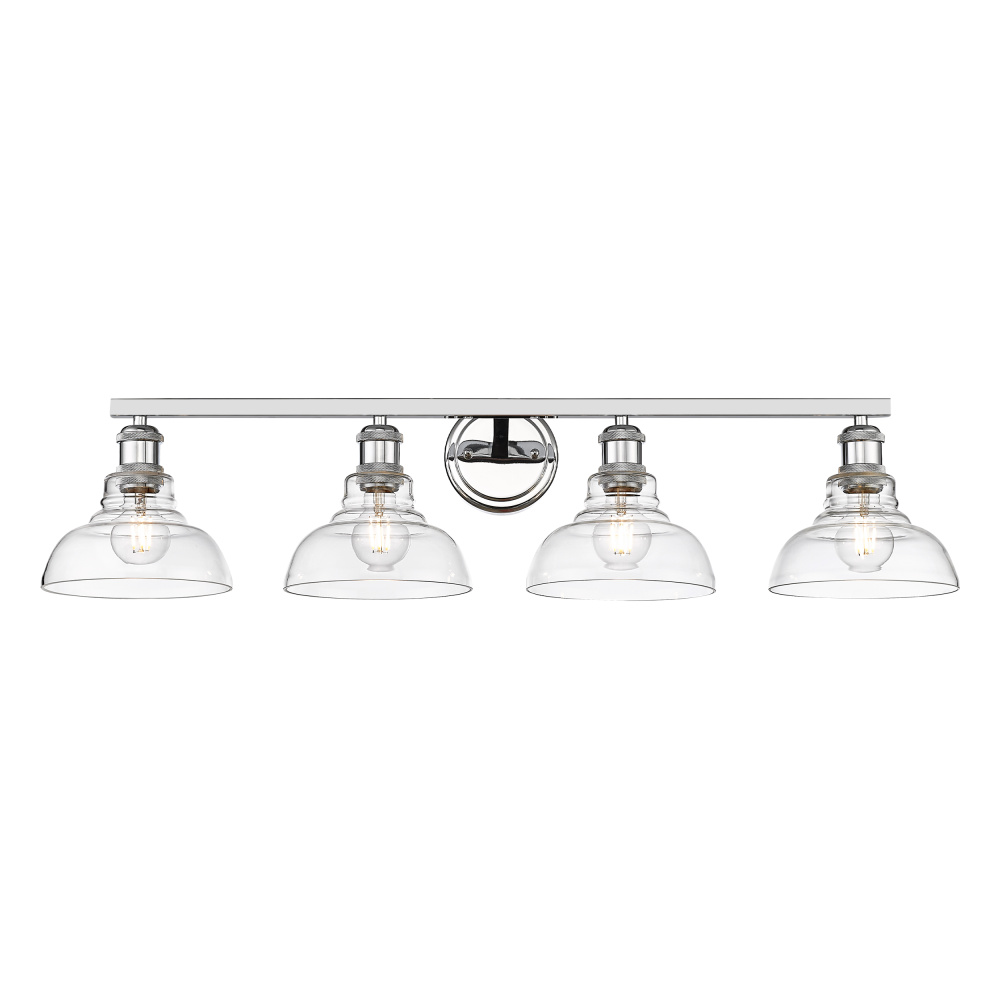 Bring transitional elegance into your home with the Yep by Golden Lighting Carver 4-light Vanity. This stunning fixture features a clear glass shade and a polished chrome frame, creating a bright and welcoming atmosphere. The clear glass shade is perfectly transparent, offering unobstructed light that highlights the beauty of both the bulb and the fixture's design. With a high-gloss shine, it complements various decor styles beautifully. The polished chrome finish is crisp, clean, and timeless, integrating seamlessly into both modern and classic aesthetics. Its durability is ensured through an easy-to-clean electroplating process. Perfect for bathrooms, this fixture is damp location rated, making it suitable for covered areas with occasional moisture. It requires no special installation, adding to its versatility. Overall Dimensions: 36"W x 8.63"H x 8.63"D. Requires 4 E26 Medium base bulbs (not included), with a maximum wattage of 60 per bulb. Enhance your lifestyle with this quality fixture that merges modern aesthetics with practicality.