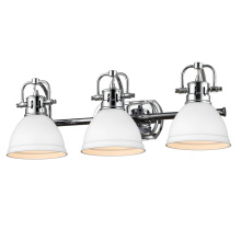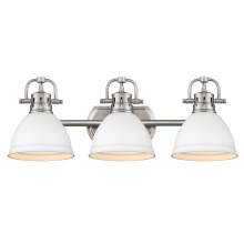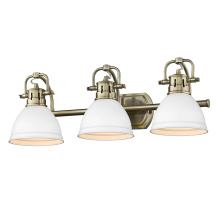 Bring farmhouse elegance into your home with the Yep by Golden Lighting Duncan 3-light Vanity. Featuring a metal shade and a rubbed bronze frame, it creates a welcoming atmosphere. The metal shade in seafoam adds a delightful light blue-green hue, perfectly complementing the vintage-inspired design. Its smooth reflective surface brings a cheerful pop of color to your space, evoking a breezy, coastal charm. This fixture is damp location-rated, making it suitable for covered and semi-enclosed spaces like bathrooms and laundry rooms. The adjustable directional heads allow you to customize the lighting to highlight specific areas, providing practicality blended with aesthetic appeal. Dimensions: Overall 24.5"W x 8.5"H x 8.25"D. Requires 3 E26 Medium base bulbs (not included), with a maximum wattage of 100 per bulb. Add a touch of retro style and quality craftsmanship to your home with this stunning vanity light.
