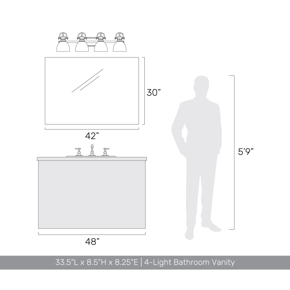 Bring farmhouse elegance into your home with the Yep by Golden Lighting Duncan 4-light Vanity. Featuring a clear glass shade and a rubbed bronze frame, it creates an inviting atmosphere. The clear glass shade perfectly showcases the bulbs, offering unobstructed light that enhances any space with its high-gloss shine. With a timeless rubbed bronze finish that provides classic warmth, this fixture complements various designs from traditional farmhouse to contemporary. Brighten up bathrooms with dedicated lighting that flatters, while ensuring safety in damp locations. The adjustable directional heads allow you to customize the lighting for optimal task illumination in covered or semi-enclosed spaces. Overall Dimensions: 33.5"W x 8.5"H x 8.25"D. Requires 4 E26 Medium base bulbs (not included), with a maximum of 100 wattage per bulb. Elevate your bathroom with this quality fixture that combines functionality and classic style.