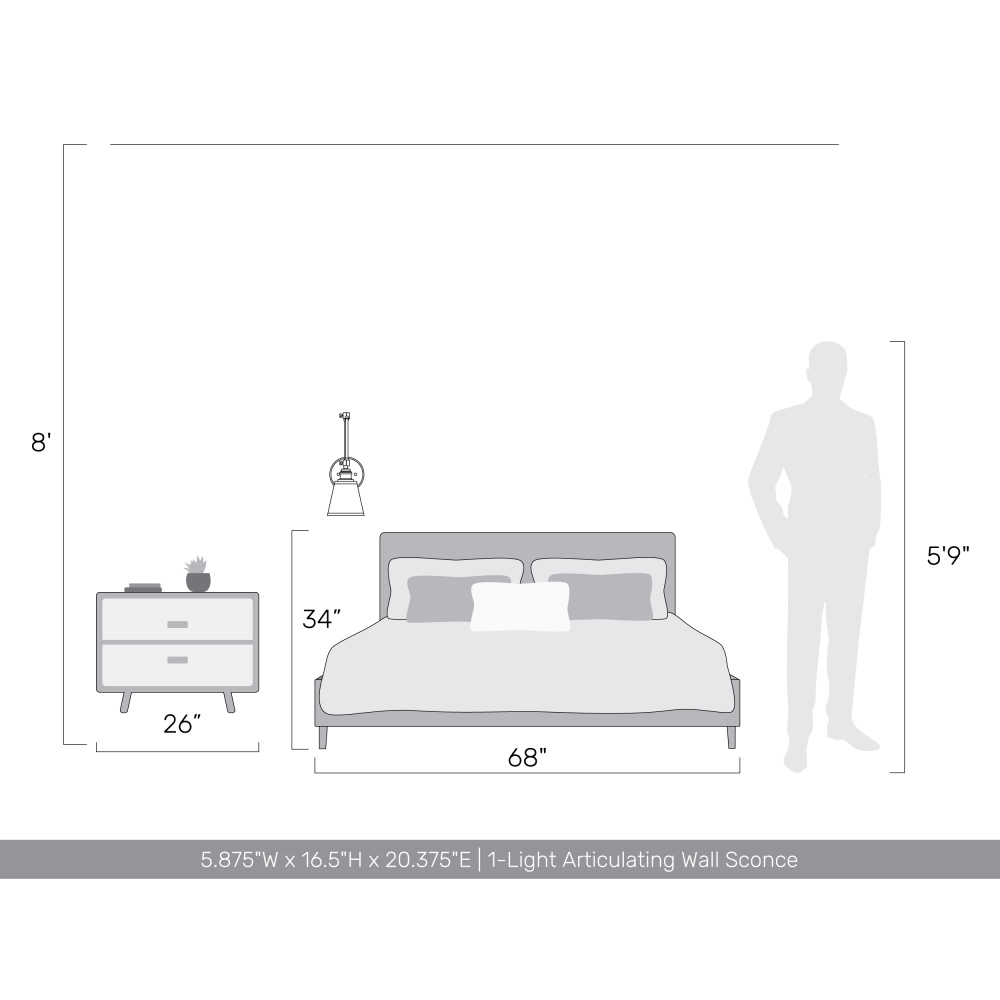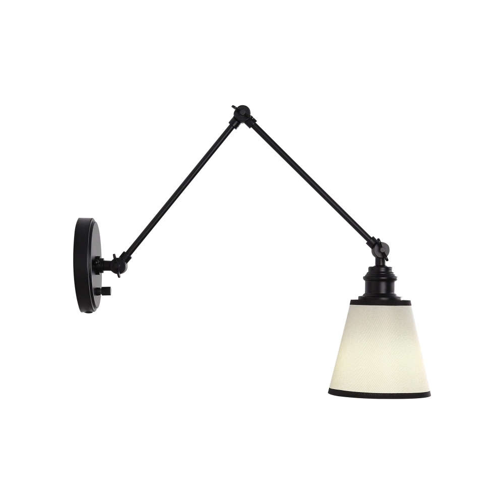 Illuminate your space with the timeless elegance of the Yep by Golden Lighting Equinox 1-light Swing Arm Wall Lamp with Black Trim shade. This fixture harmonizes modern and transitional styles, featuring a fabric shade and a matte black frame that creates a refined atmosphere. The fabric shade with black trim provides soft, even light that enhances your decor. The matte black finish complements a range of interiors, from minimalist to contemporary. This lamp is damp location rated, making it suitable for covered areas, and its adjustable arm allows you to direct light where you need it most—ideal for bedrooms and home offices. With overall dimensions of 5.88"W x 16.5"H x 20.38"D, it requires one E26 medium base bulb (not included, max 60 watts) for illumination. Experience versatility and comfort with this sophisticated lighting solution.