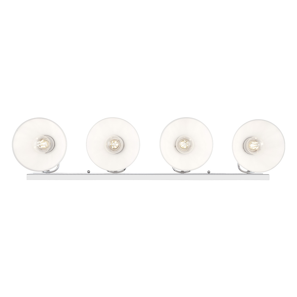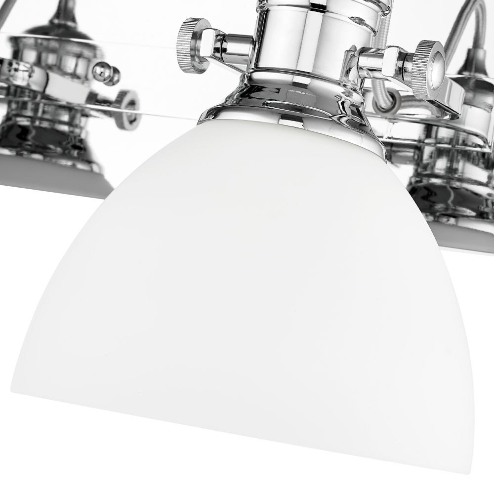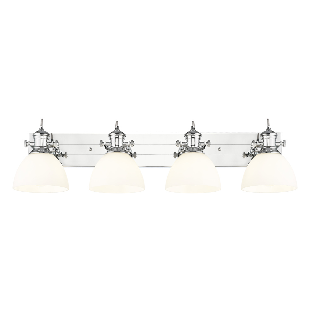 Bring Farmhouse elegance into your home with the Yep by Golden Lighting Hines 4-light Vanity in Chrome and Opal Glass. Featuring an opal glass shade and a polished chrome frame, it creates a welcoming atmosphere. The opal glass shade is crafted to diffuse light evenly, providing a soft, glare-free glow. Timeless and elegant, this shade enhances the vintage-inspired charm of the fixture. Brilliant and timeless, the polished chrome finish offers a crisp, clean look suitable for both traditional and contemporary settings. Its mirror-like surface contributes a stunning high-shine gleam that brightens your space. This vanity light is damp location rated, making it perfect for covered and semi-enclosed areas like bathrooms. It comes with adjustable directional heads, allowing customization of the lighting to highlight specific areas. Overall dimensions are 34.63"W x 8.75"H x 8.25"D, and it requires 4 E26 Medium base bulbs (60 watt max, not included). Elevate your bathroom decor with this quality fixture that blends style and functionality.
