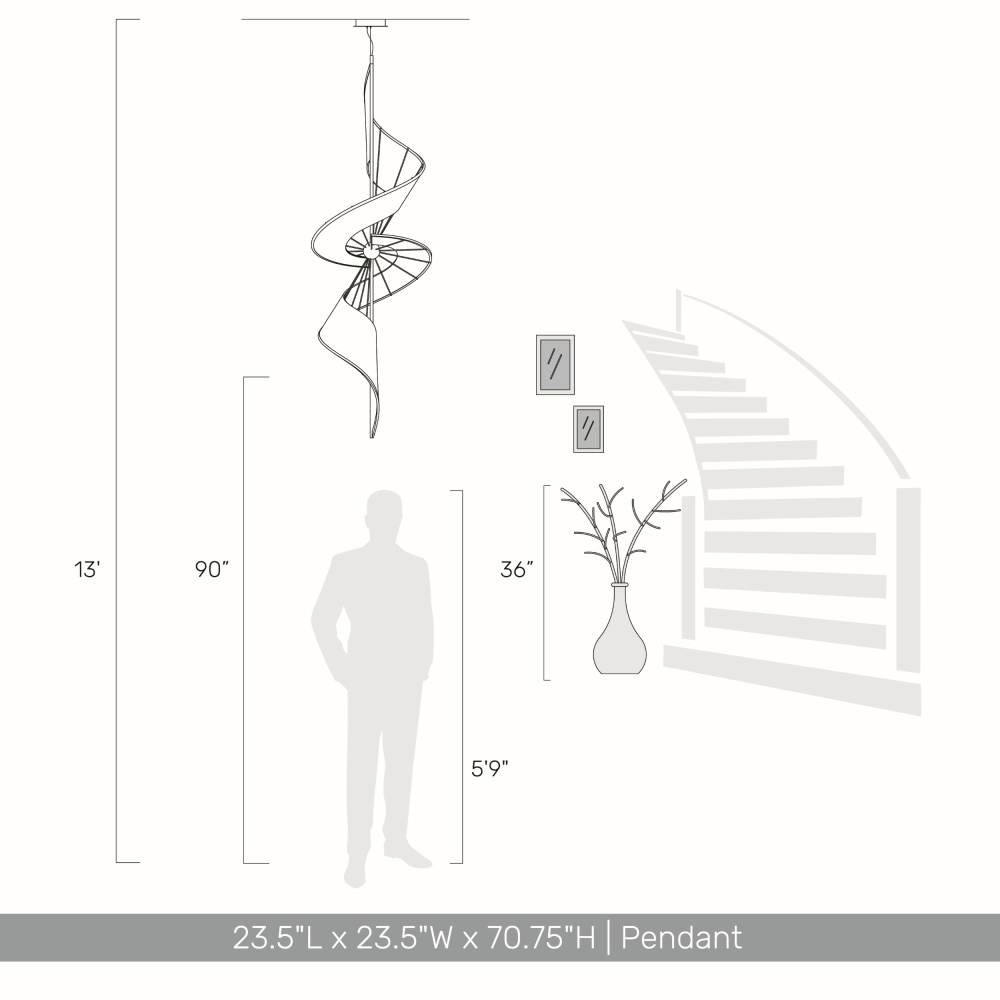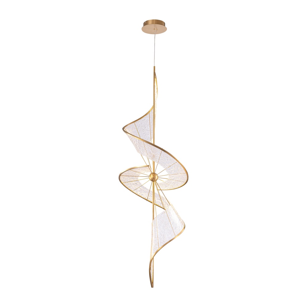 Illuminate your home with the stunning Ziva by Golden Lighting Aurora Integrated LED Pendant. This piece showcases a contemporary design that elevates modern elegance. With no shade, the integrated LED technology offers a direct and brilliant light source, creating an architectural statement in your space. It beautifully embodies the essence of modern design, with sculptural forms reminiscent of flowing dancers. The brushed champagne finish enriches the aesthetic with understated luxury, combining gold’s warmth with silver’s softness. Its chic and versatile finish catches the light, complementing various interior styles. Dry location rated, this pendant is perfect for kitchens, dining rooms, or entryways. Installation is a breeze with sloped ceiling compatibility and height adjustability (min: 74.5", max: 190.75"). Overall dimensions are 23.5"W x 70.75"H x 23.5"D, with a powerful integrated LED rated for 2250 lumens and a 3CCT feature for customizable color temperatures. Transform your space with this statement piece, merging function and artistry into a captivating centerpiece. Showroom Only.