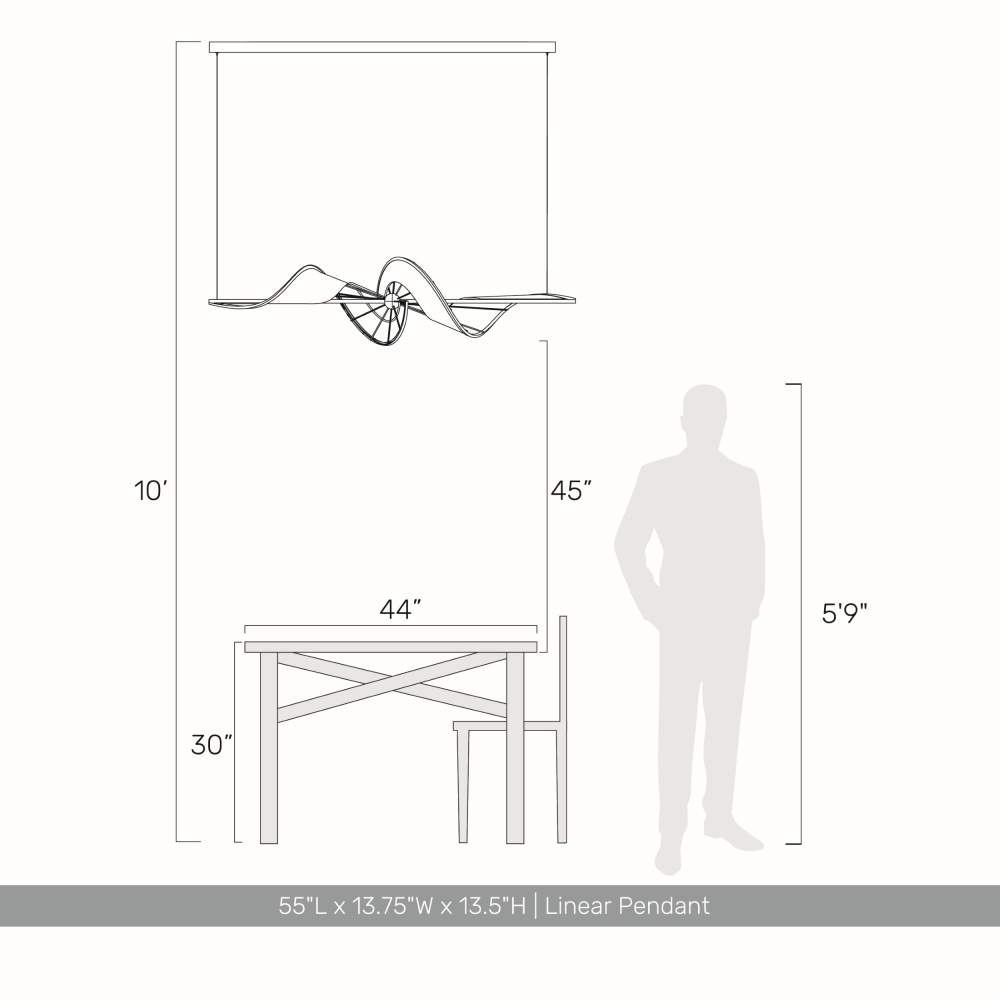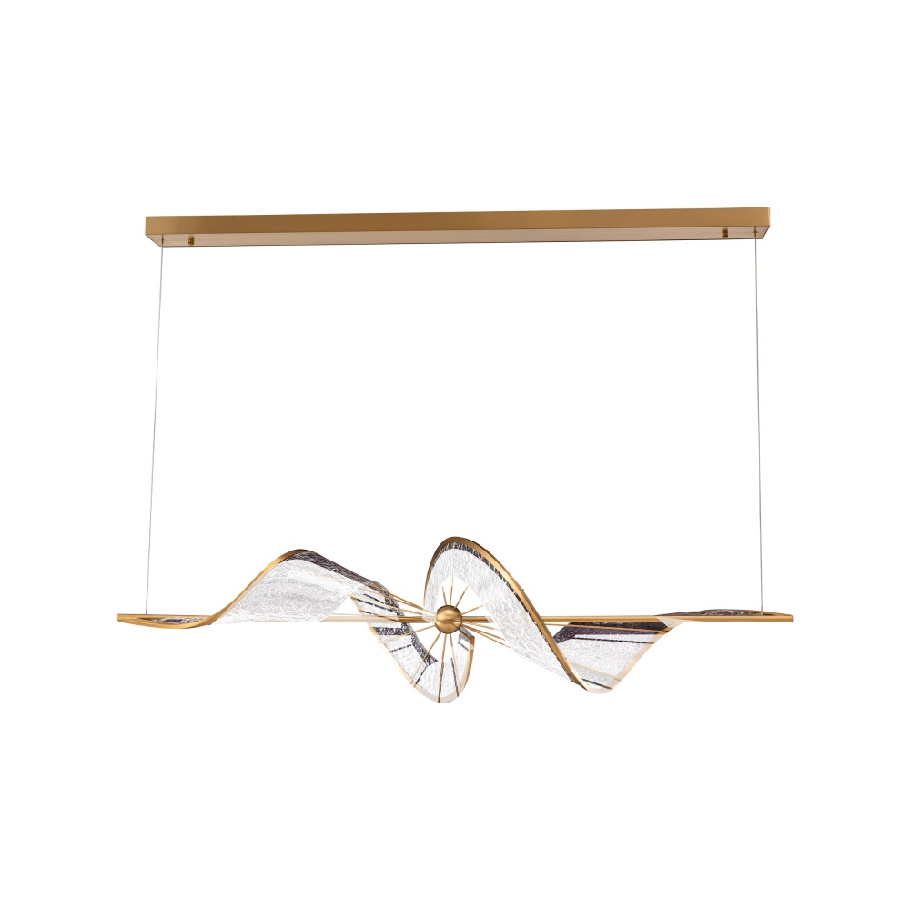 Elevate your kitchen with the Ziva by Golden Lighting Aurora Integrated LED Island Light. This stunning fixture merges bold design with modern functionality. With no shade, the integrated LED technology produces bright light, perfect for cooking and entertaining. Its flowing, sculptural form reflects a sense of movement and artistry in your space. The brushed champagne finish exudes elegance, blending the warmth of gold with a soft silver sheen—perfect for creating a sophisticated atmosphere. Rated for dry locations, this light is especially suited for kitchen islands, providing both utility and style. Enjoy easy installation with sloped ceiling compatibility and an adjustable height (min: 17", max: 126.25"). Overall dimensions are 55"W x 13.5"H x 13.75"D, featuring integrated LED rated for 1080 lumens and customizable color temperatures with the 3CCT feature. Bring a blend of utility and modern artistry into your home with this striking addition. Showroom Only.