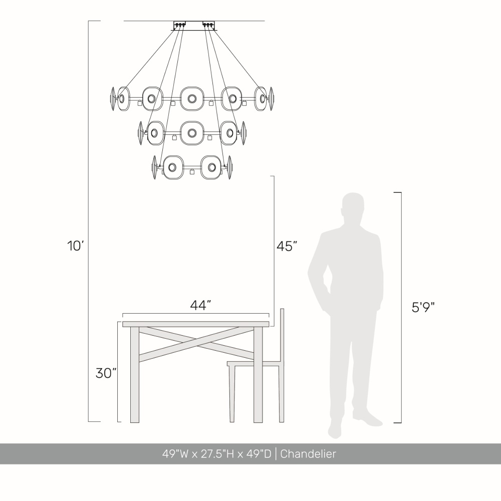 Elevate your home with the stunning Ziva by Golden Lighting Celestia 26-light Integrated LED Chandelier. This remarkable piece melds modern luxury with timeless elegance, making it a captivating focal point in any room. Designed with a sleek architectural frame, the chandelier showcases flawless K9 crystal discs, casting a beautiful halo of light and creating a dazzling display as light refracts through the meticulously polished crystals. The polished chrome finish offers a crisp, clean look, integrating seamlessly with various decor styles while being easy to maintain. Ideal for dry locations, this chandelier is perfect for bedrooms, living rooms, and hallways. It’s sloped ceiling compatible and adjustable from 57.5" to 165.25", allowing for customized installation. With overall dimensions of 49"W x 27.5"H x 49"D and integrated LED technology providing 4160 rated lumens at a warm 3000K color temperature, this chandelier delivers brilliant illumination while enhancing your space. Crafted for quality and aesthetic appeal, the Ziva by Golden Lighting Celestia 26-light chandelier is an exemplary addition to any elegant home. Showroom Only.