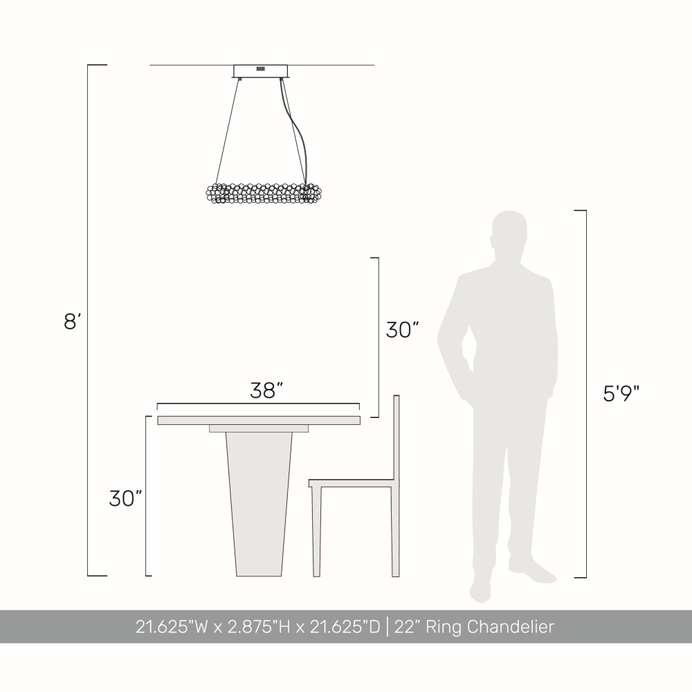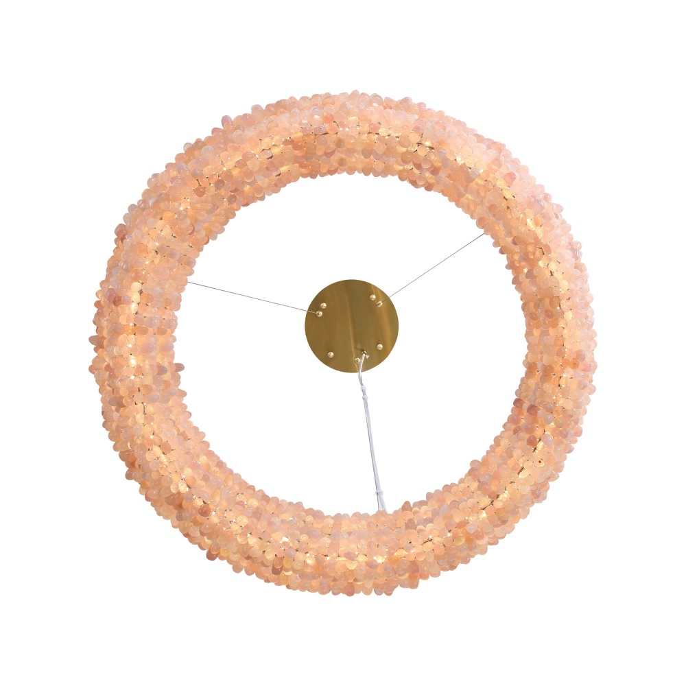 Experience nature-inspired elegance with the Ziva by Golden Lighting Corallo Integrated LED 22in Chandelier. Crafted from exquisite natural gemstones, this chandelier creates a captivating focal point with its unique design. Hand-selected rose quartz stones evoke the tranquility of ocean coral reefs, illuminating the space with a soft, radiant glow when lit. Dry-location rated, this chandelier is perfect for indoor spaces such as dining rooms and living areas, providing an enchanting atmosphere. Sloped-ceiling compatible with an adjustable height design, it can be customized to suit your home. Overall dimensions are 21.63"W x 2.88"H x 21.63"D, featuring integrated LED technology for brilliant, energy-efficient illumination with a long-lasting light source that provides 4540.38 rated lumens at a 3000K CCT. Discover the perfect blend of organic beauty and modern functionality in your living spaces.