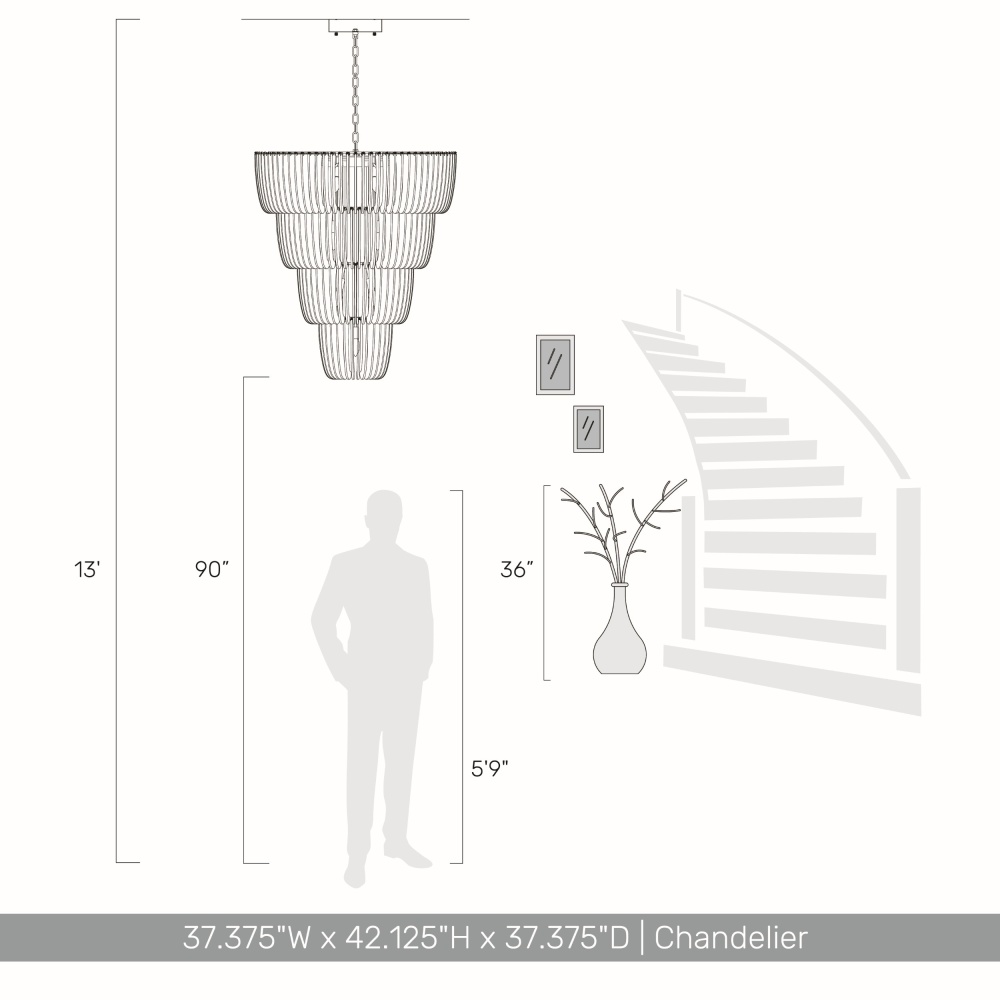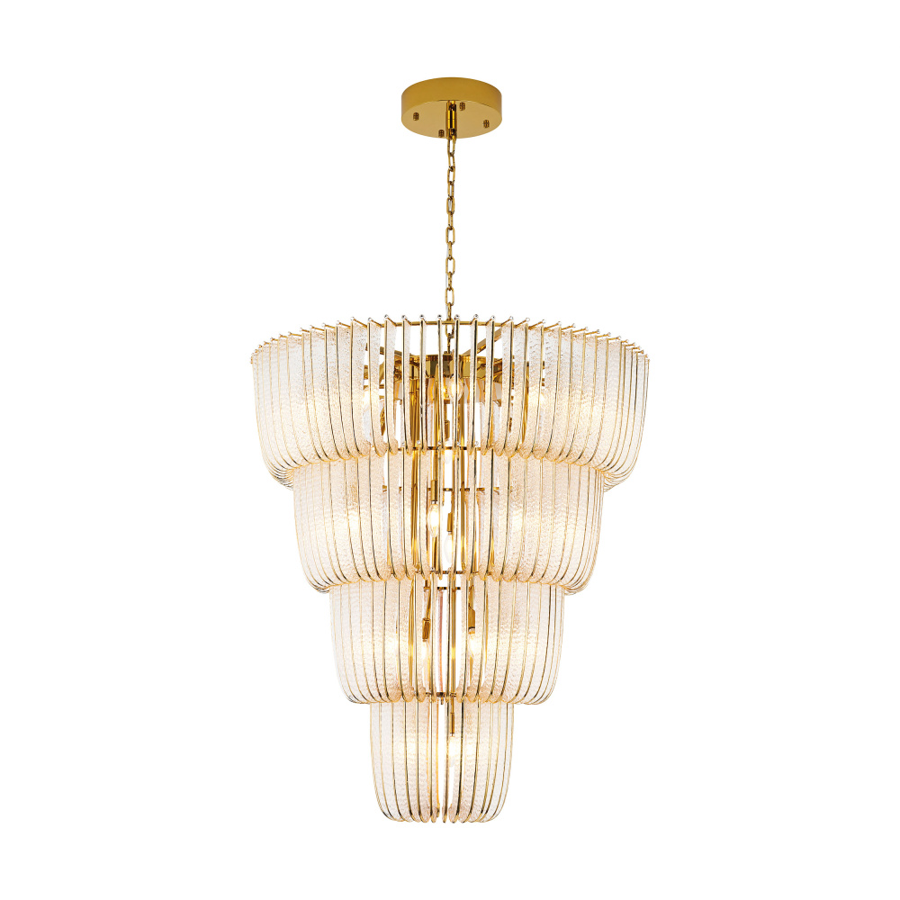 Bring royal elegance into your home with the Ziva by Golden Lighting Shahi 29-light Chandelier. Featuring a captivating Titanium Gold finish, it infuses your space with sophistication and warmth. Each light is adorned with intricately designed hammered glass panels, artfully interplay light and texture, enhancing the chic ambiance. The luxurious finish enhances its striking appearance, making this chandelier a significant highlight in your home. Perfect for dry locations, it is ideally suited for indoor setups, adding grandeur to dining rooms and grand entryways. With its sloped-ceiling compatibility and adjustable height ranging from 47.125" to 118.125", it can be tailored to fit your home's architecture flawlessly. Overall dimensions measure 37.38"W x 42.13"H x 37.38"D, and it requires 29 E12 candelabra base bulbs (not included), with a maximum wattage of 5 per bulb. Enhance your interior design with the timeless luxury of this magnificent chandelier. Showroom Only.