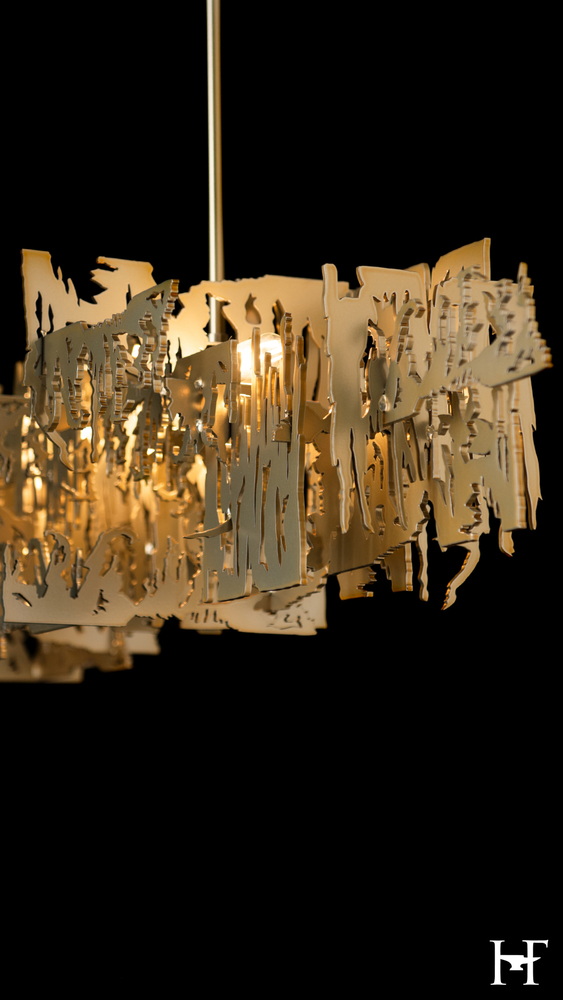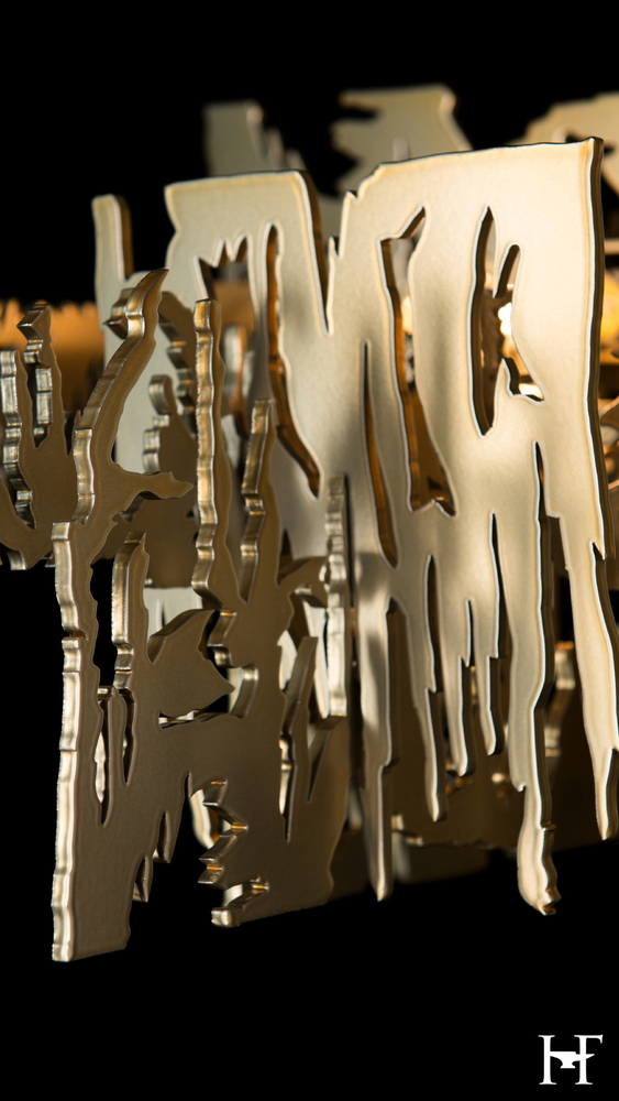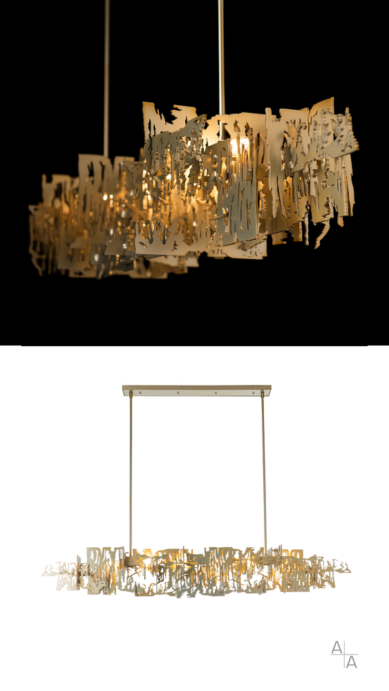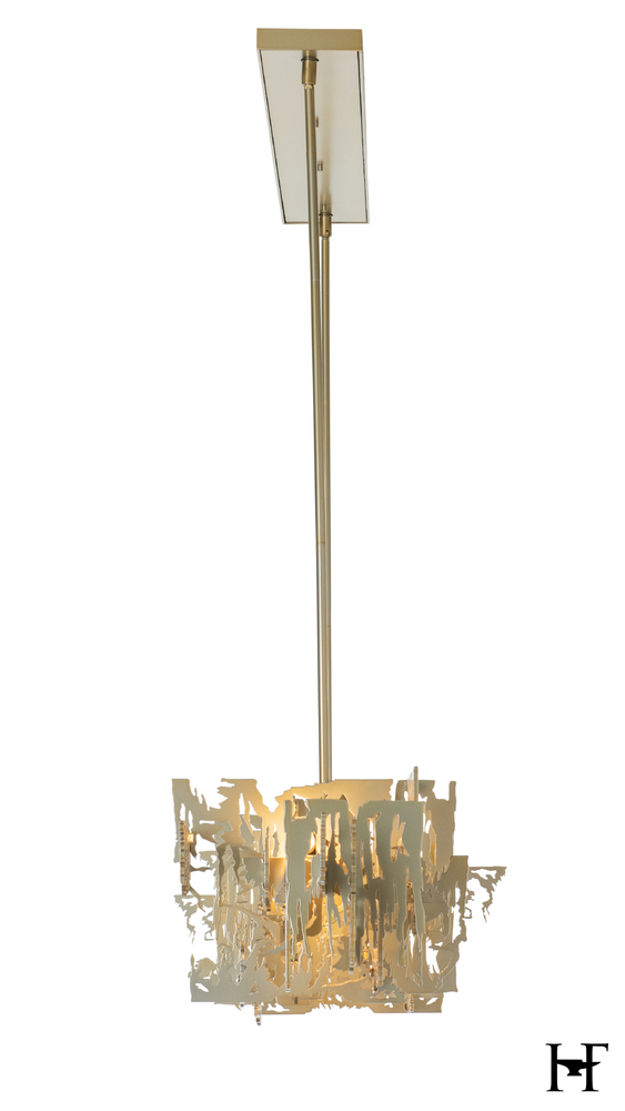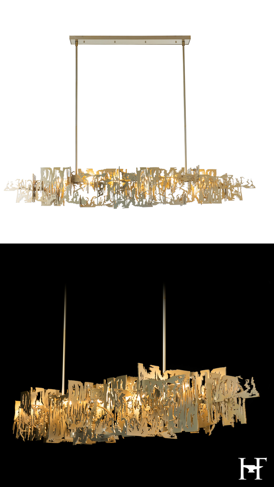 At over 5 ft in breadth, this large Brutus Pendant makes a bold statement in any space. The Brutalism movement of the ‘60s and ‘70s is apparent in this pendant design. Designer Jason Hancock created a complex metal puzzle whose pieces are combined to create a unique, one-of-a-kind lighting fixture. Part of ART + ALCHEMY by Hubbardton Forge.
