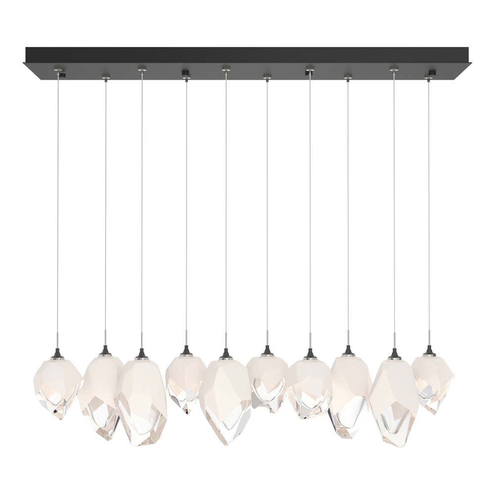 Five Large Chrysalis pendants and five Small Chrysalis pendants hung from a rectangular canopy. Each pendant may be individually adjusted for a custom look. Note, the upper canopy can will always be black while the canopy faceplate will match the selected finish.