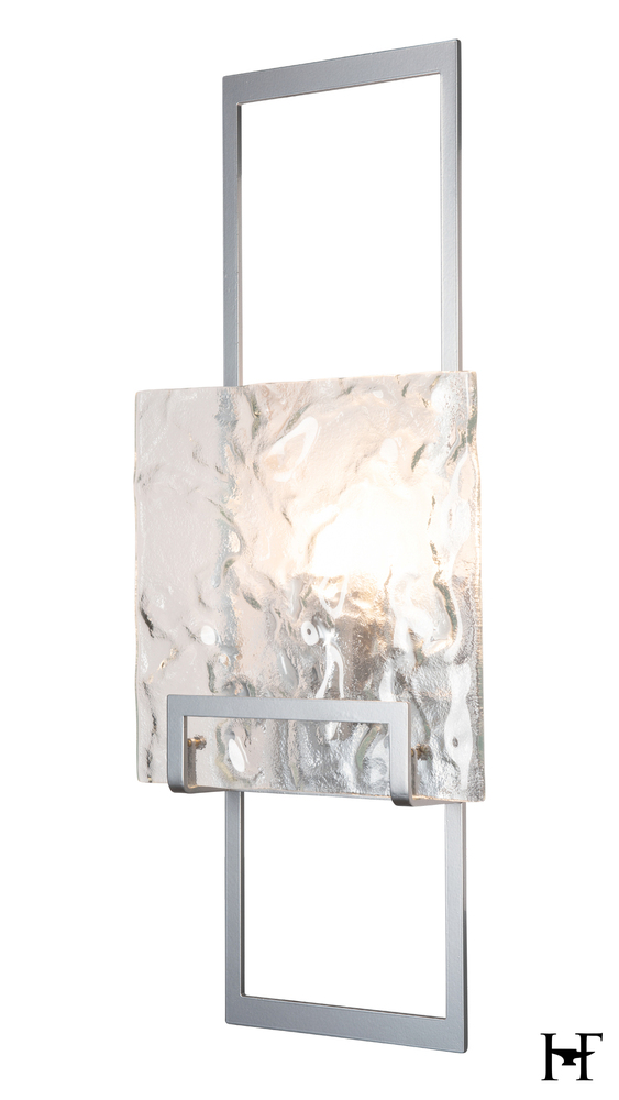 A tall, open rectangular piece of steel holds a large clear, textured glass square panel giving the Geo Sconce an angular yet distinguished allure. Very geometric in design, with clean simple lines, the Geo adds a touch of modern style to any space.
