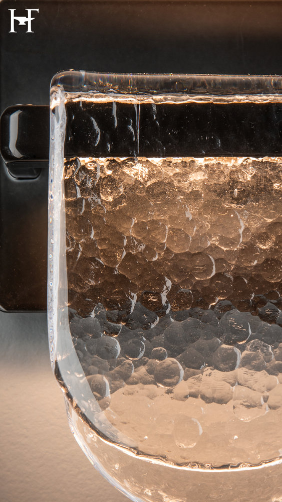 Small and stunning. This glass is beautifully hand-crafted by our friends at AO Glassworks in Vermont. Clear, heavily textured glass is hand-poured and shaped to create this unique wall sconce. The thick glass bends over a small metal bar, giving it the delicate whimsy of a meandering riverbed.