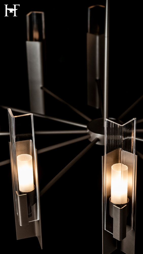 Designer Ori Goldberg expanded upon a jewelry design of his to create the Summit 12-Light Pendant. Three right angles—metal/glass/metal—are positioned in ways that up the ante and bridges traditional to contemporary style with its clean, geometric lines.